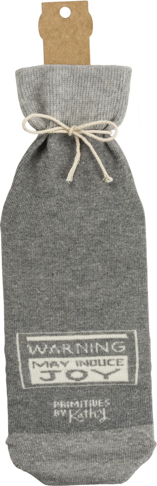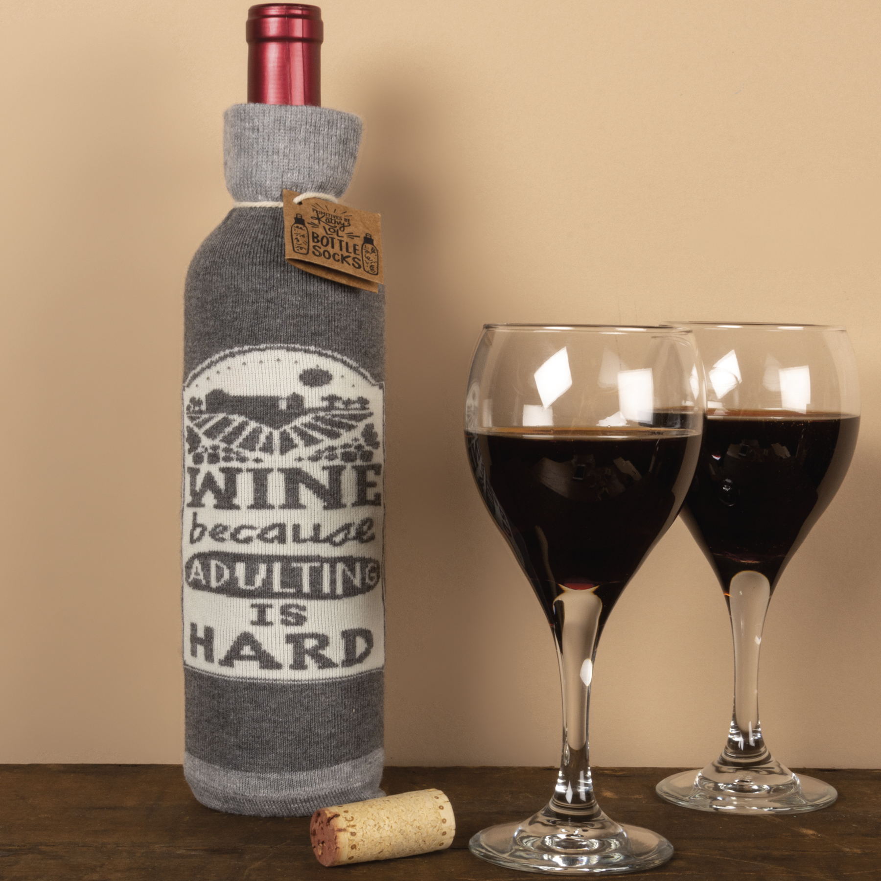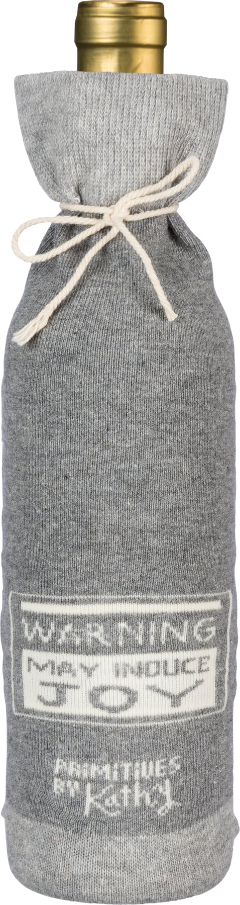 A creative alternative for a traditional gift bag, a washable and re-useable "Wine - Because Adulting Is Hard" knit bottle sock with reverse "Warning - May Induce Joy" sentiment.
