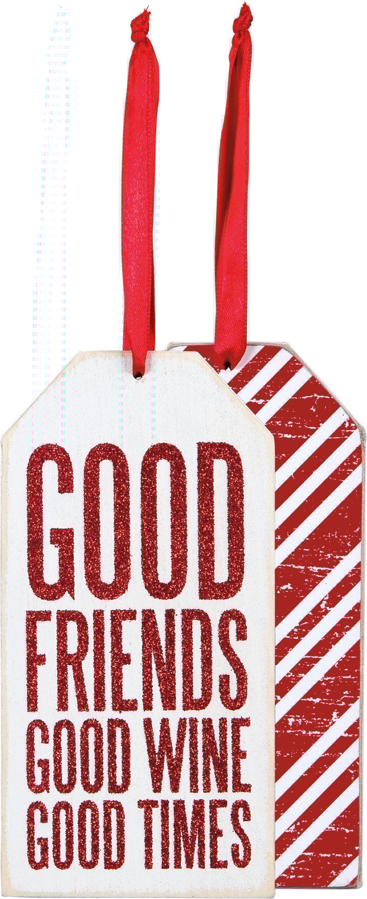 A white and red wooden bottle tag featuring a front "Good Friends - Good Wine - Good Times" sentiment, glitter details, and reverse diagonal striped print. Contains a top fabric loop for attaching to a bottle of wine.
