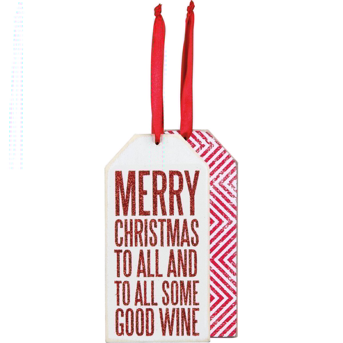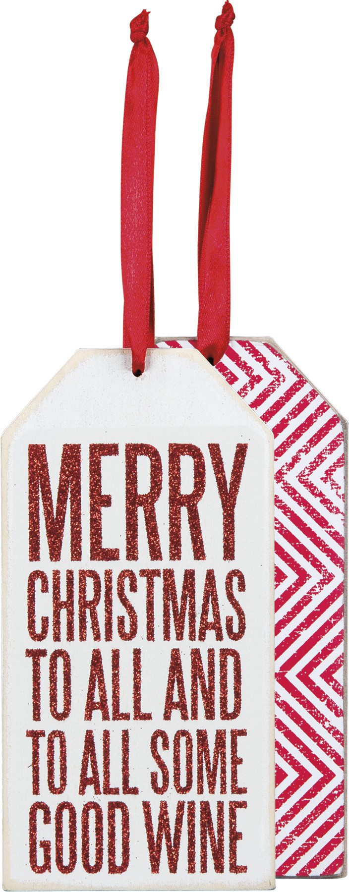 A red and white wooden bottle tag featuring a humorous "Merry Christmas To All And To All Some Good Wine" sentiment, glitter details, reverse zigzag designs, and top fabric loop for attaching to a bottle of wine.