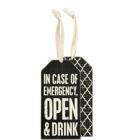 Classic black and white wooden bottle tag featuring distressed "In Case Of Emergency, Open & Drink" sentiment with reverse designs. Top fabric loop for attaching to a bottle of wine.