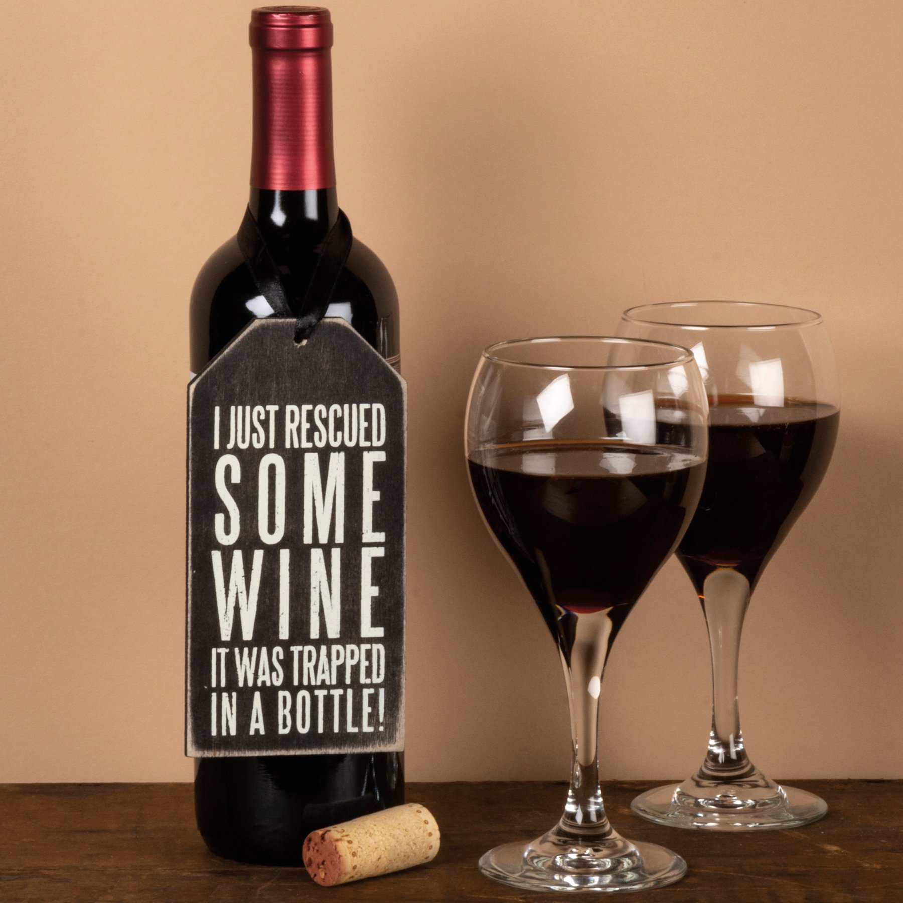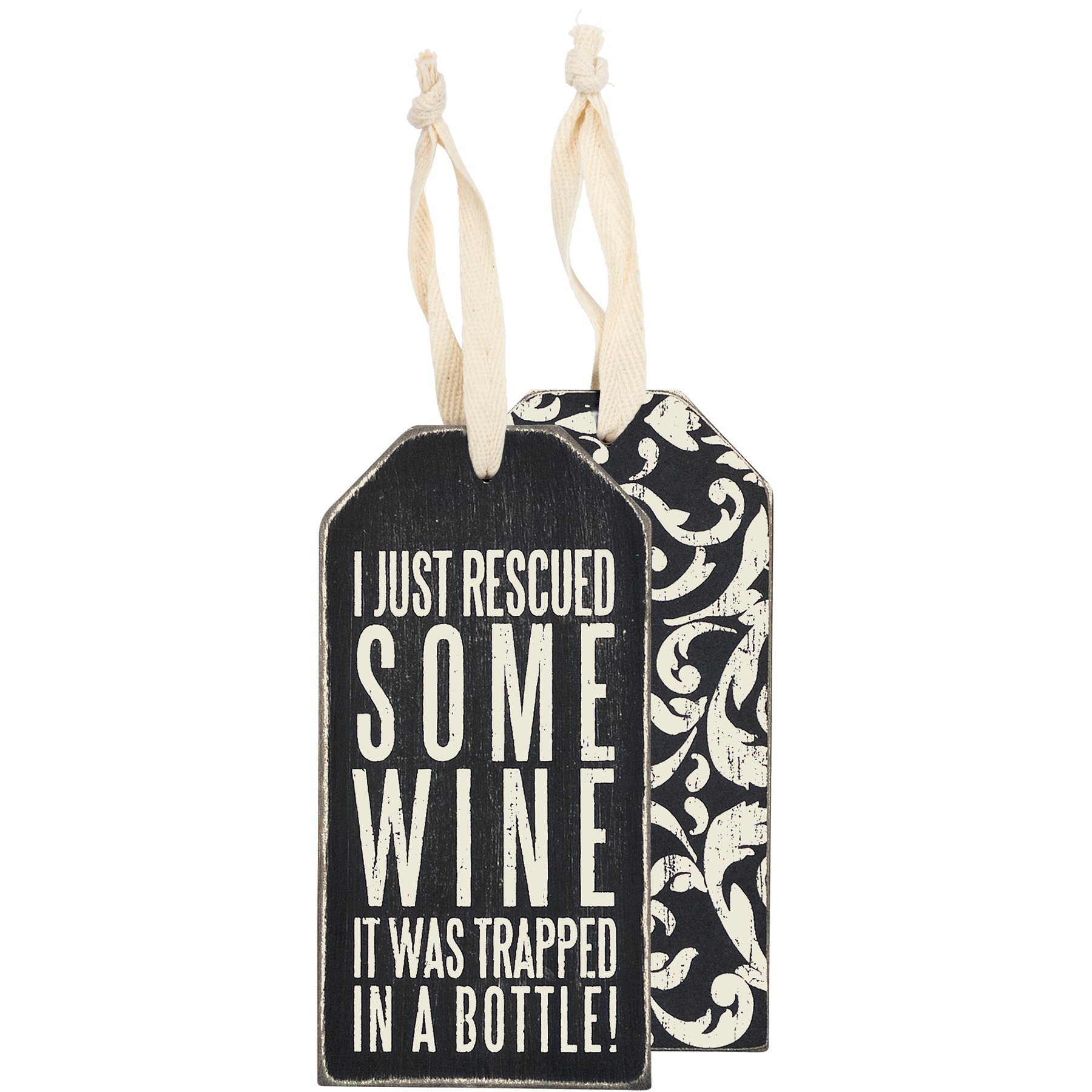 Classic black and white wooden bottle tag featuring distressed "I Just Rescued Some Wine - It Was Trapped In A Bottle!" sentiment with reverse designs. Top fabric loop for attaching to a bottle of wine.