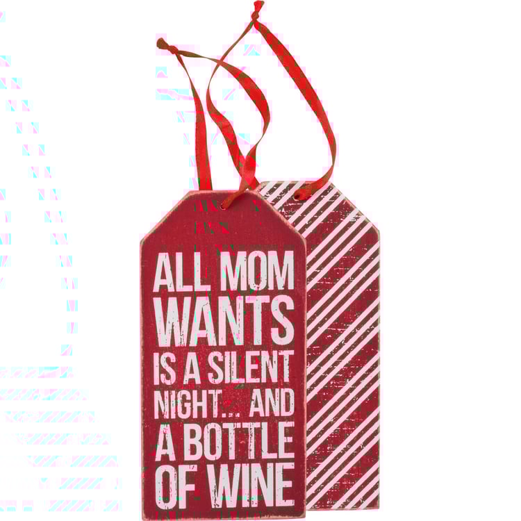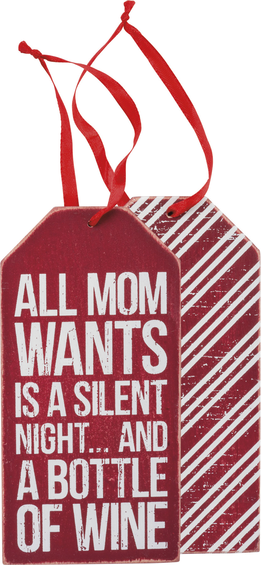 A red and white wooden bottle tag featuring a front "All Mom Wants Is A Silent Night… And A Bottle Of Wine" sentiment and reverse diagonal striped print. Contains a top fabric loop for attaching to a bottle of wine.