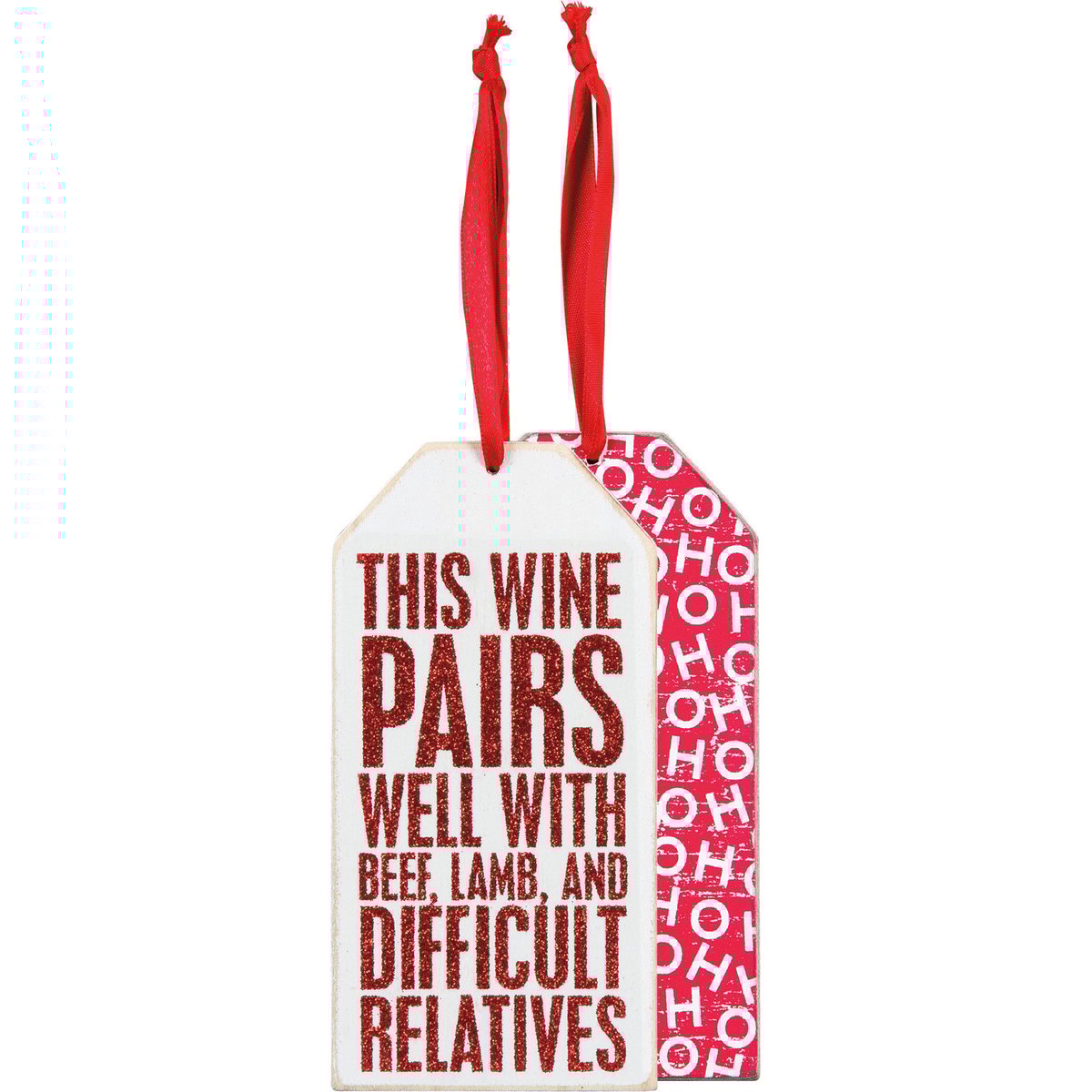 A red and white wooden bottle tag featuring a humorous "This Wine Pairs Well With Beef, Lamb, And Difficult Relatives" sentiment, glitter details, reverse "Ho Ho Ho" print, and top fabric loop for attaching to a bottle of wine.