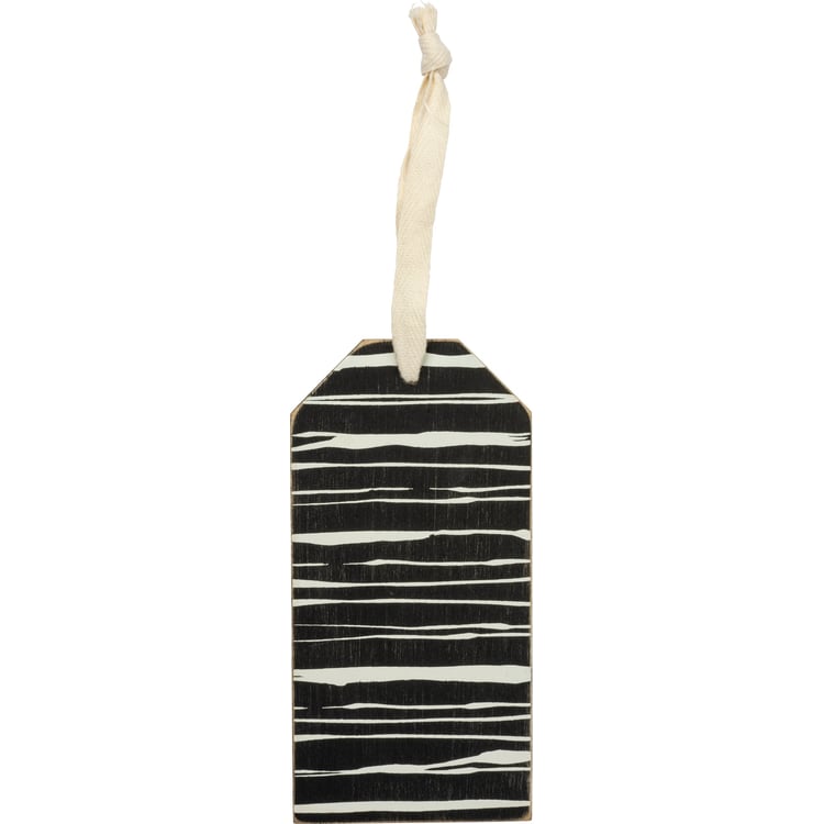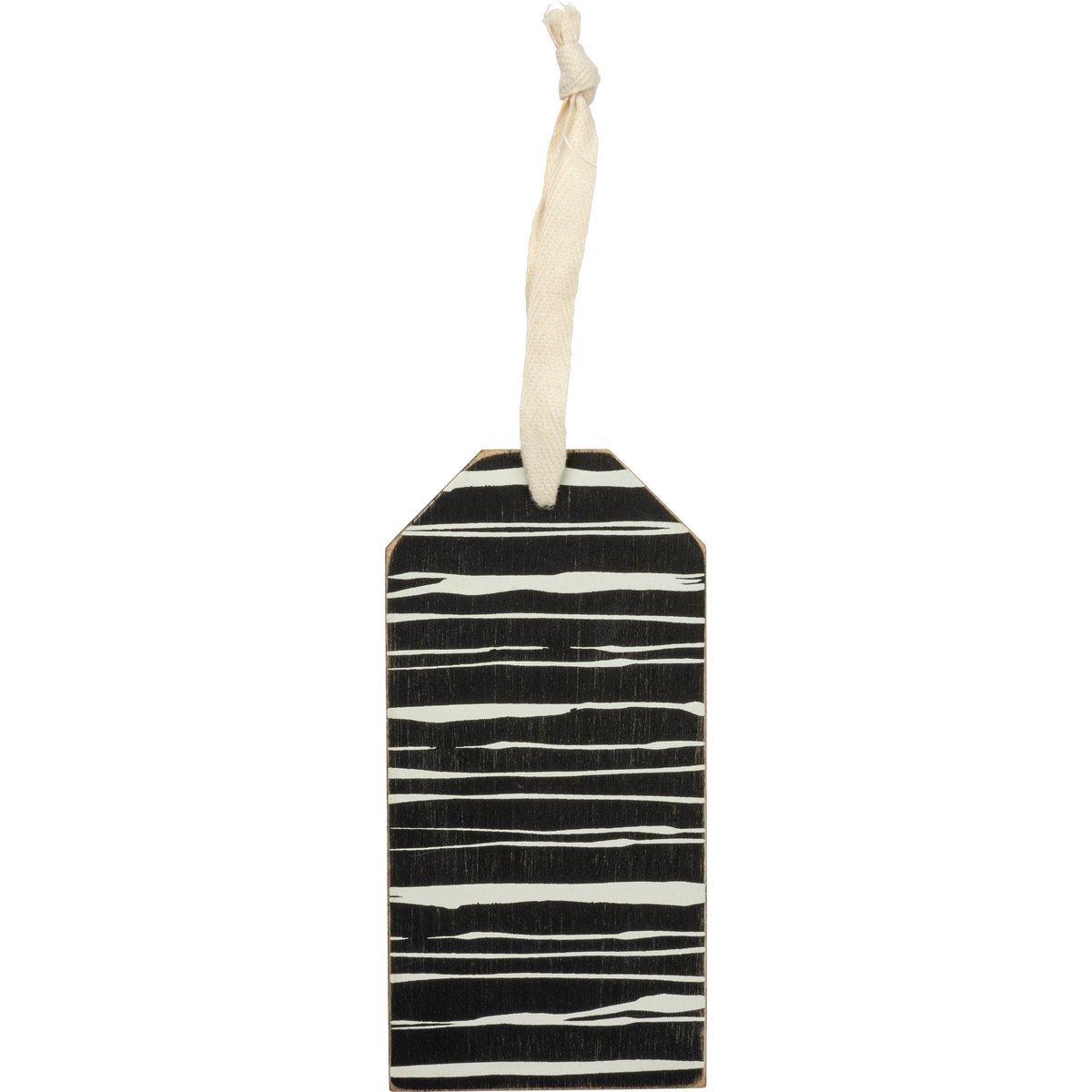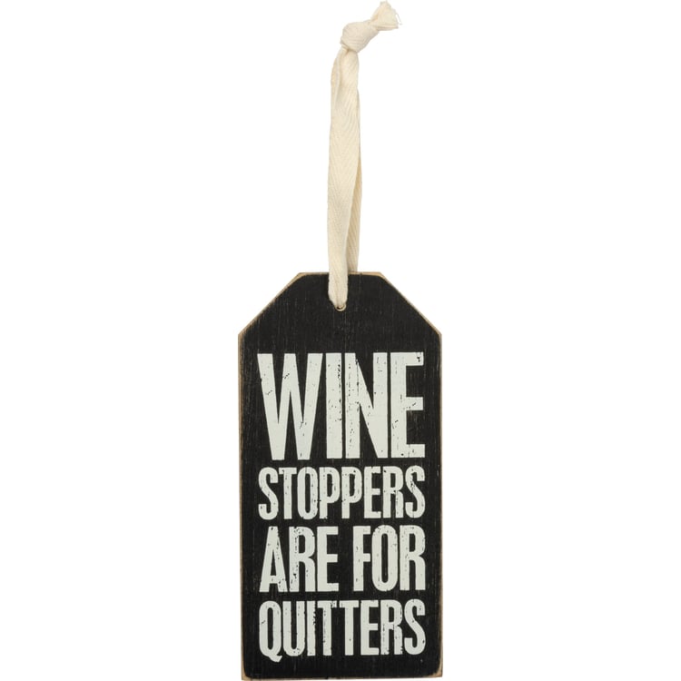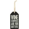 A classic black and white bottle tag featuring a distressed "Wine Stoppers Are For Quitters" sentiment, reverse stripe designs, and top fabric loop for attaching to a bottle of wine.