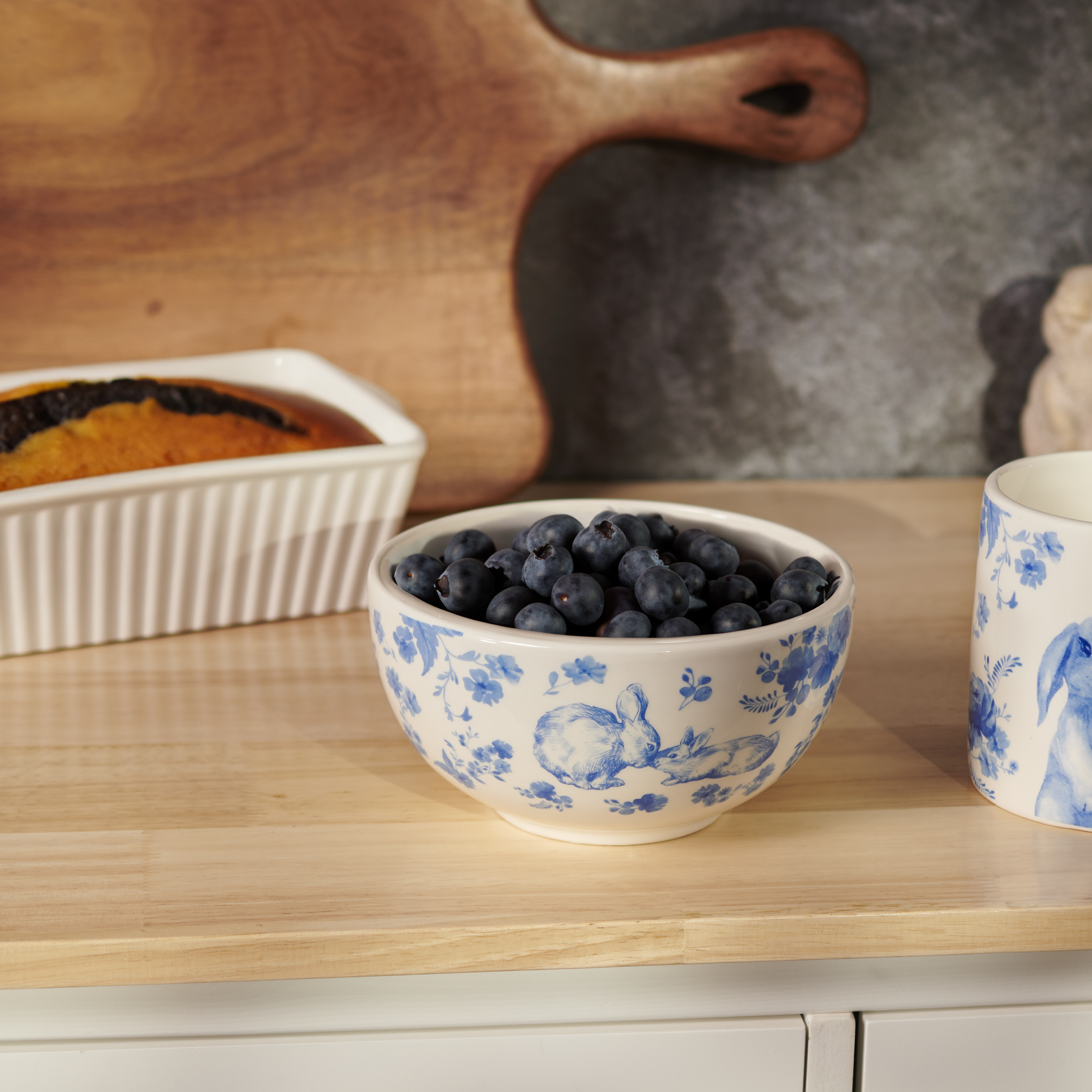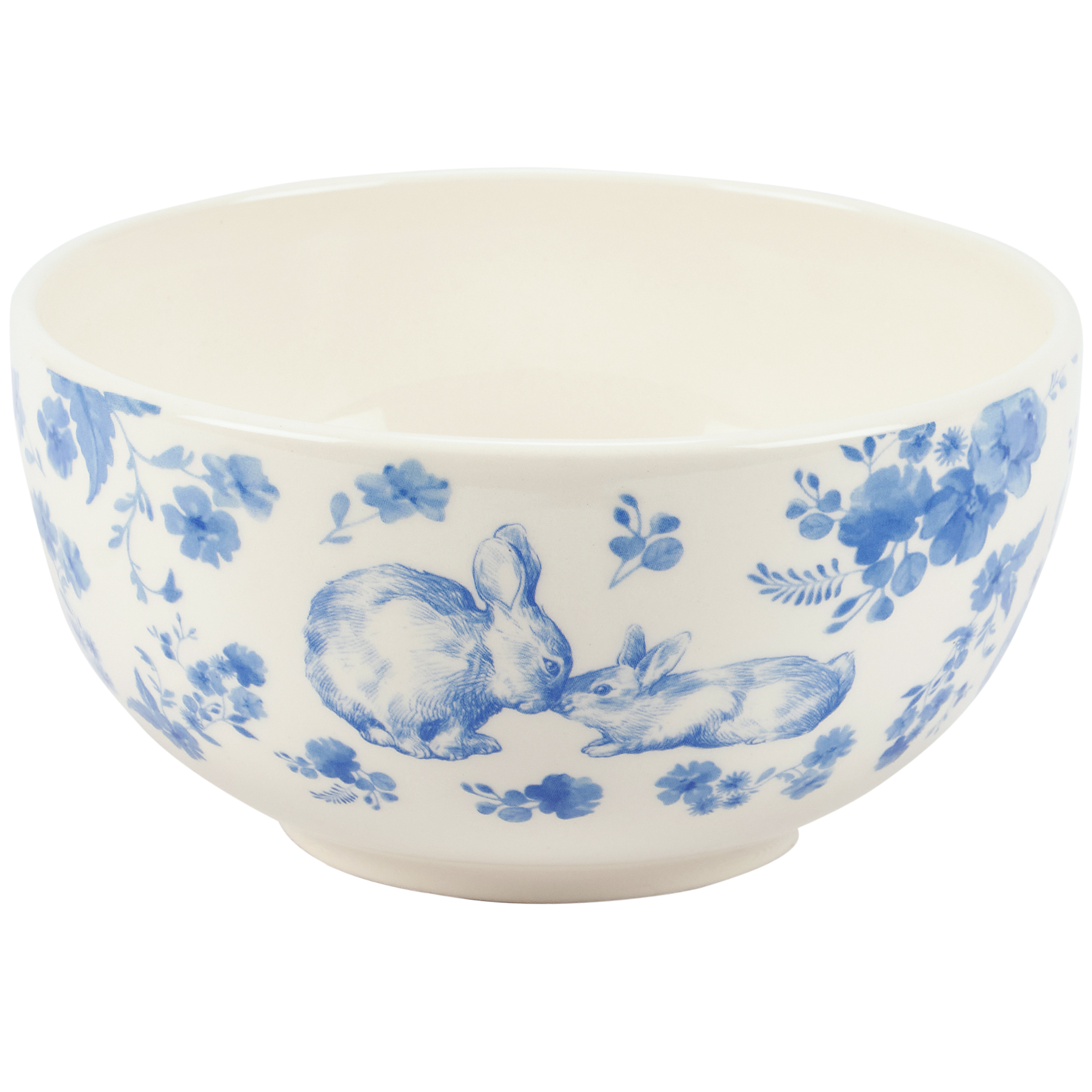 A lightweight, but durable ceramic bowl from our Easter & Spring Collection displaying a clean white glaze finish with indigo designs of florals and rabbits in a hand illustrated style. Our Blue Floral Rabbit bowl is hand wash only. A piece of vintage tableware perfect for spring gatherings.