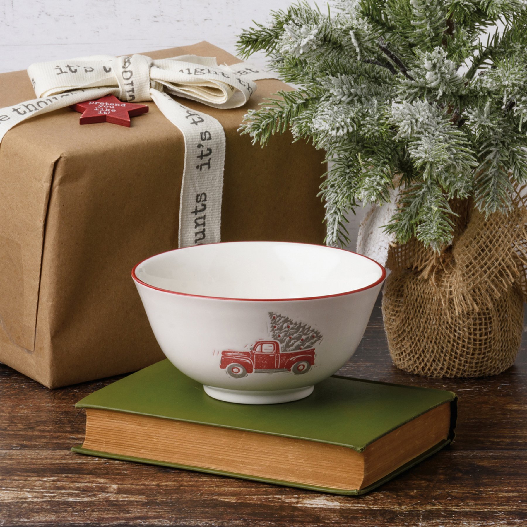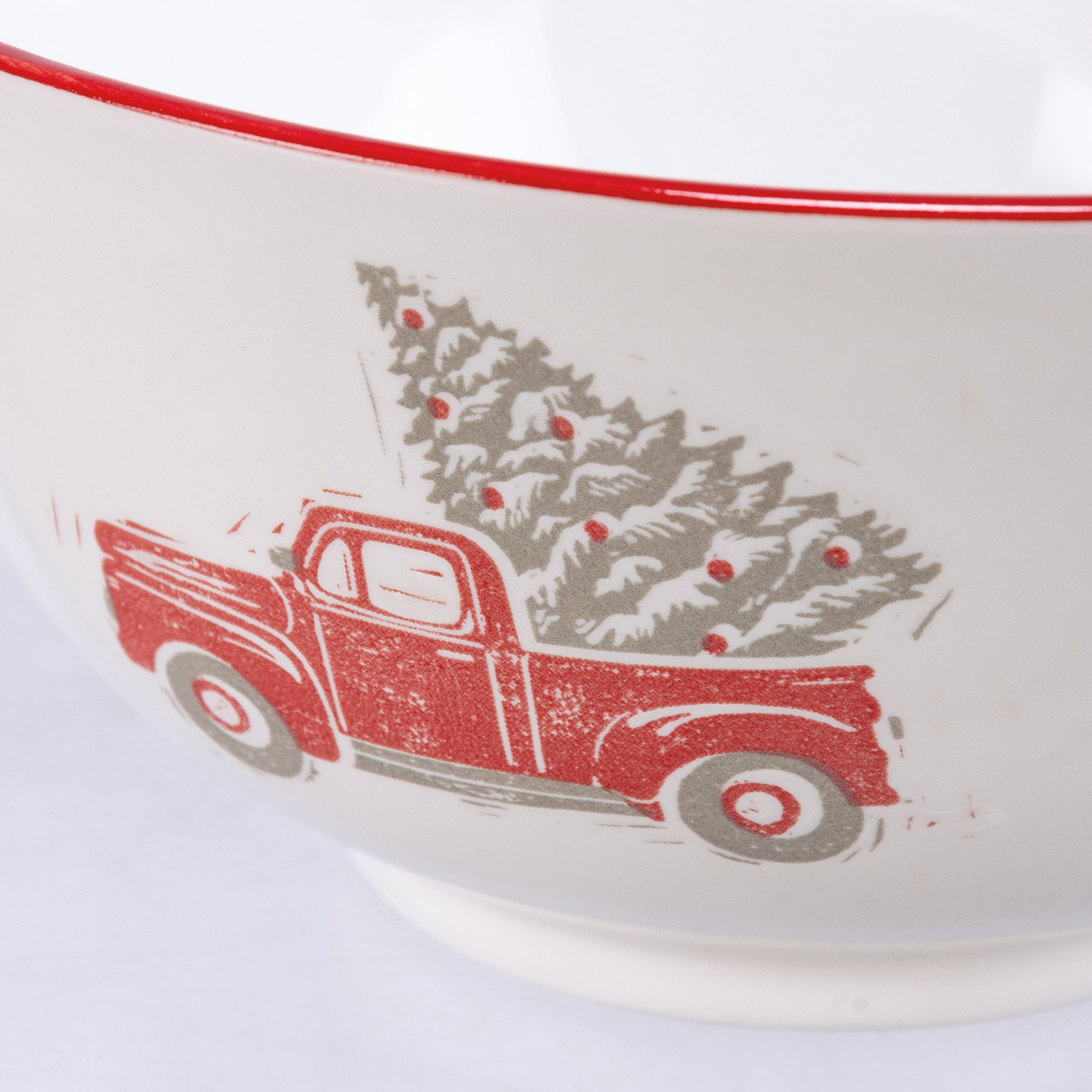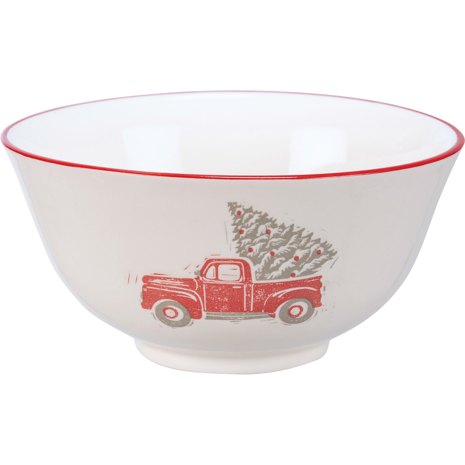 A stoneware bowl featuring a red truck and Christmas tree design with debossed details. Red rim adds interest to design. Red truck bowl is microwave, dishwasher, and food safe.