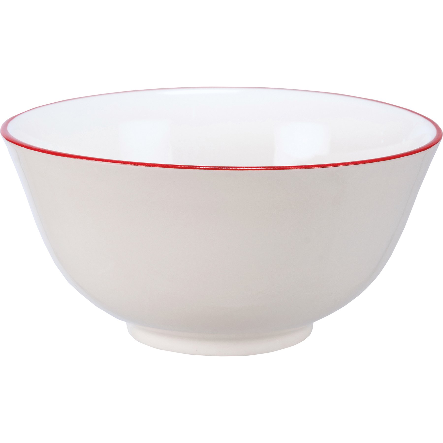 A stoneware bowl featuring a red truck and Christmas tree design with debossed details. Red rim adds interest to design. Red truck bowl is microwave, dishwasher, and food safe.