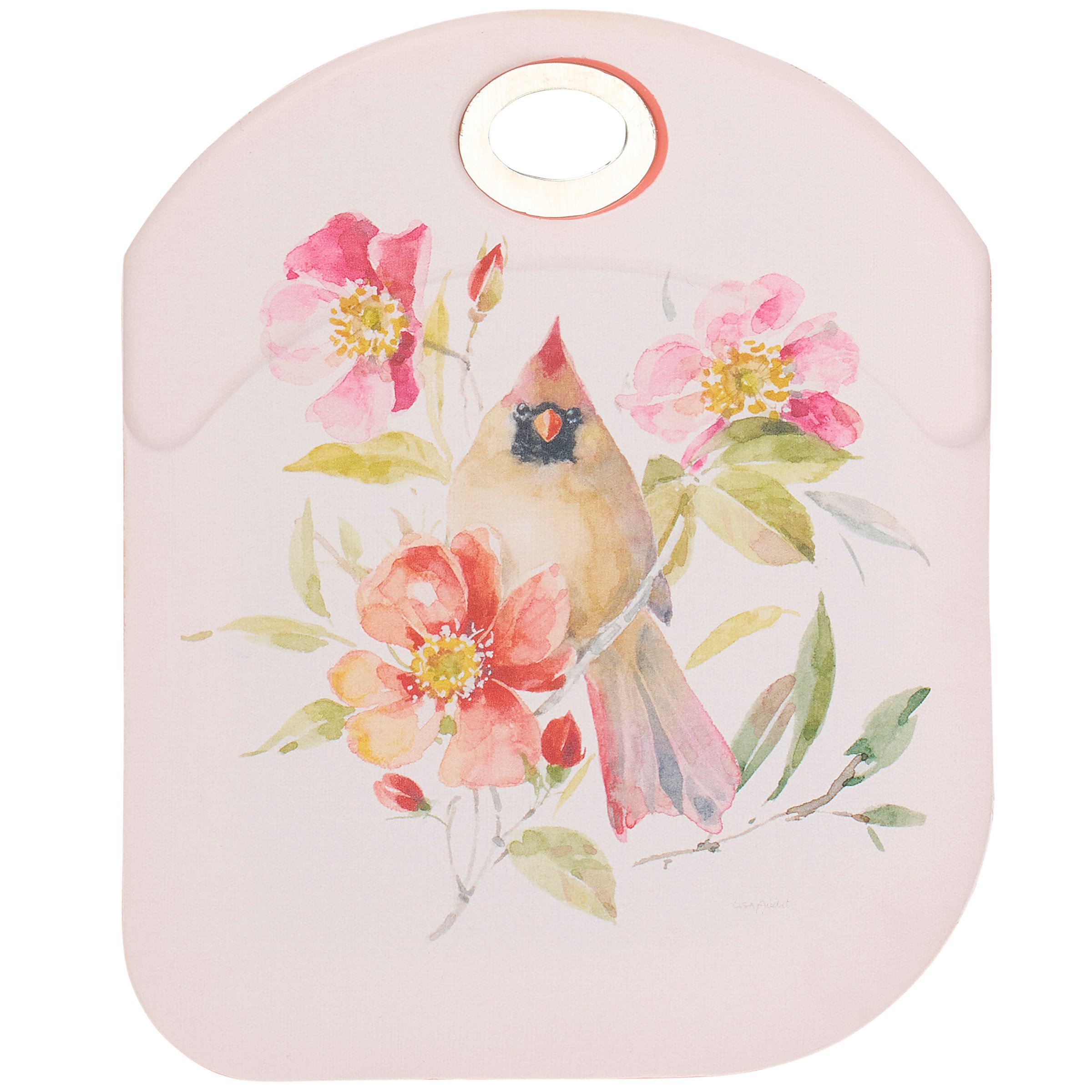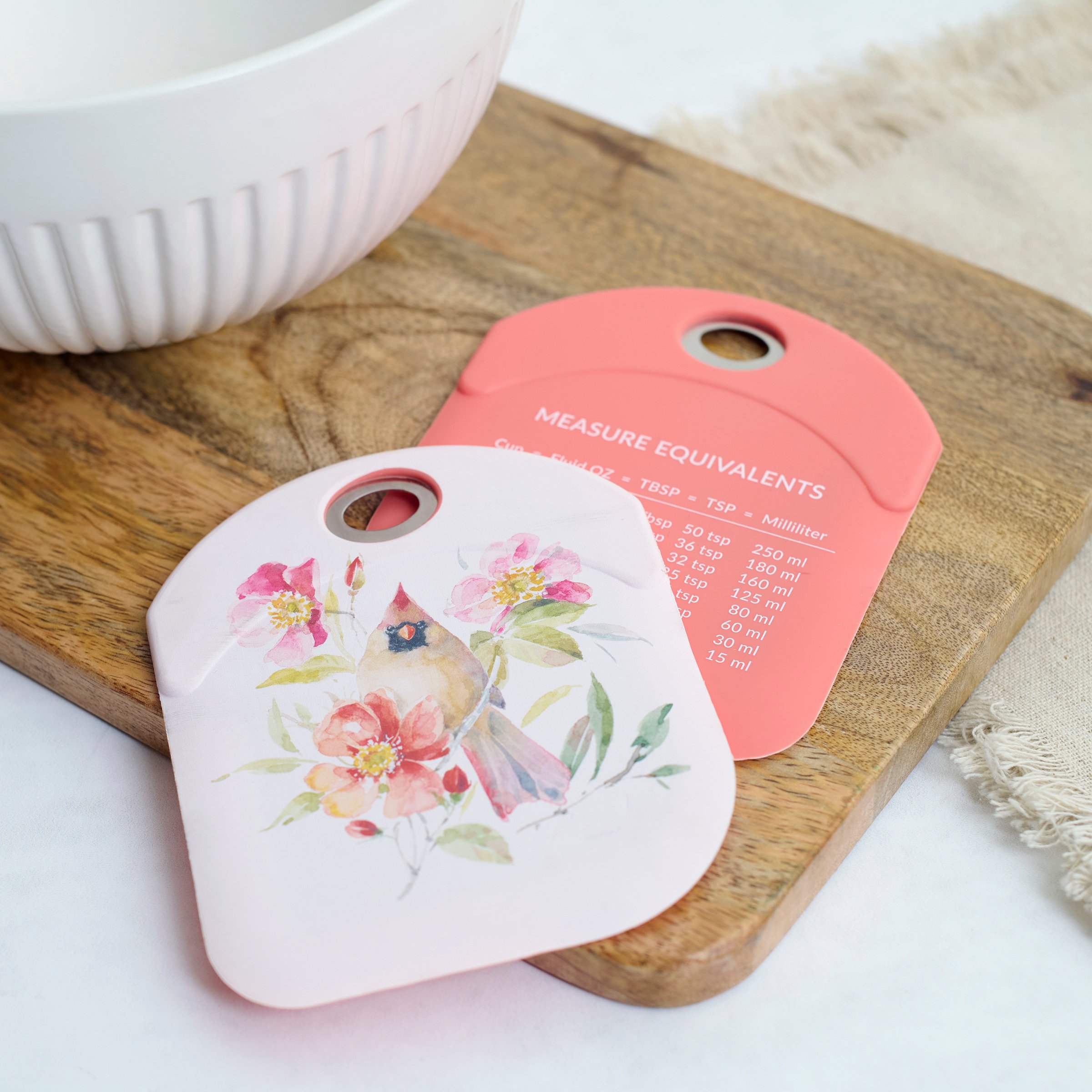 A double-sided silicone bowl scraper from our Botanical Collection displaying a charming scene of a cardinal with colorful summer flowers. Everyday cardinal design is replicated from original art hand painted in a delicate watercolor style. Our Everyday Cardinal bowl scraper features a sturdy stainless steel handle and convenient measurement equivalents on the back for easier baking. Silicone bowl scraper is hand wash only. A cardinal themed kitchen accessory great for gifting.