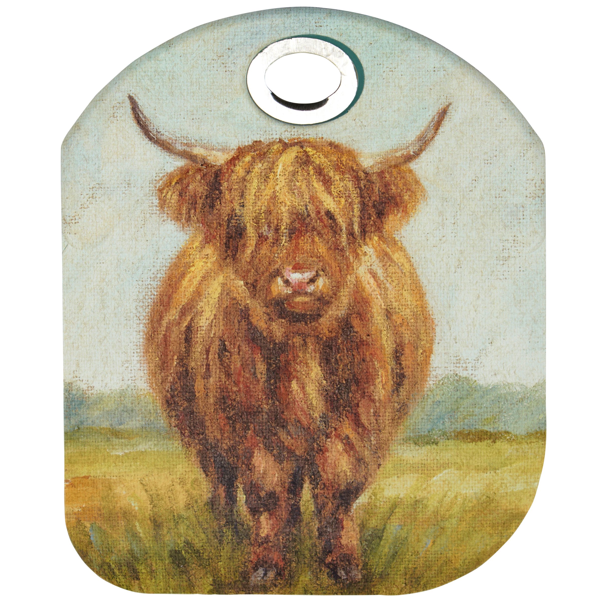 A double-sided silicone bowl scraper from our Farmhouse Collection displaying a charming scene of a highland cow in a field. Highland cow design is replicated from original artwork painted onto burlap canvas, giving the art a unique depth and texture. Our Highland Cow bowl scraper features a sturdy stainless steel handle and convenient measurement equivalents on the back for easier baking. Silicone bowl scraper is hand wash only. A farm-themed kitchen accessory great for gifting.