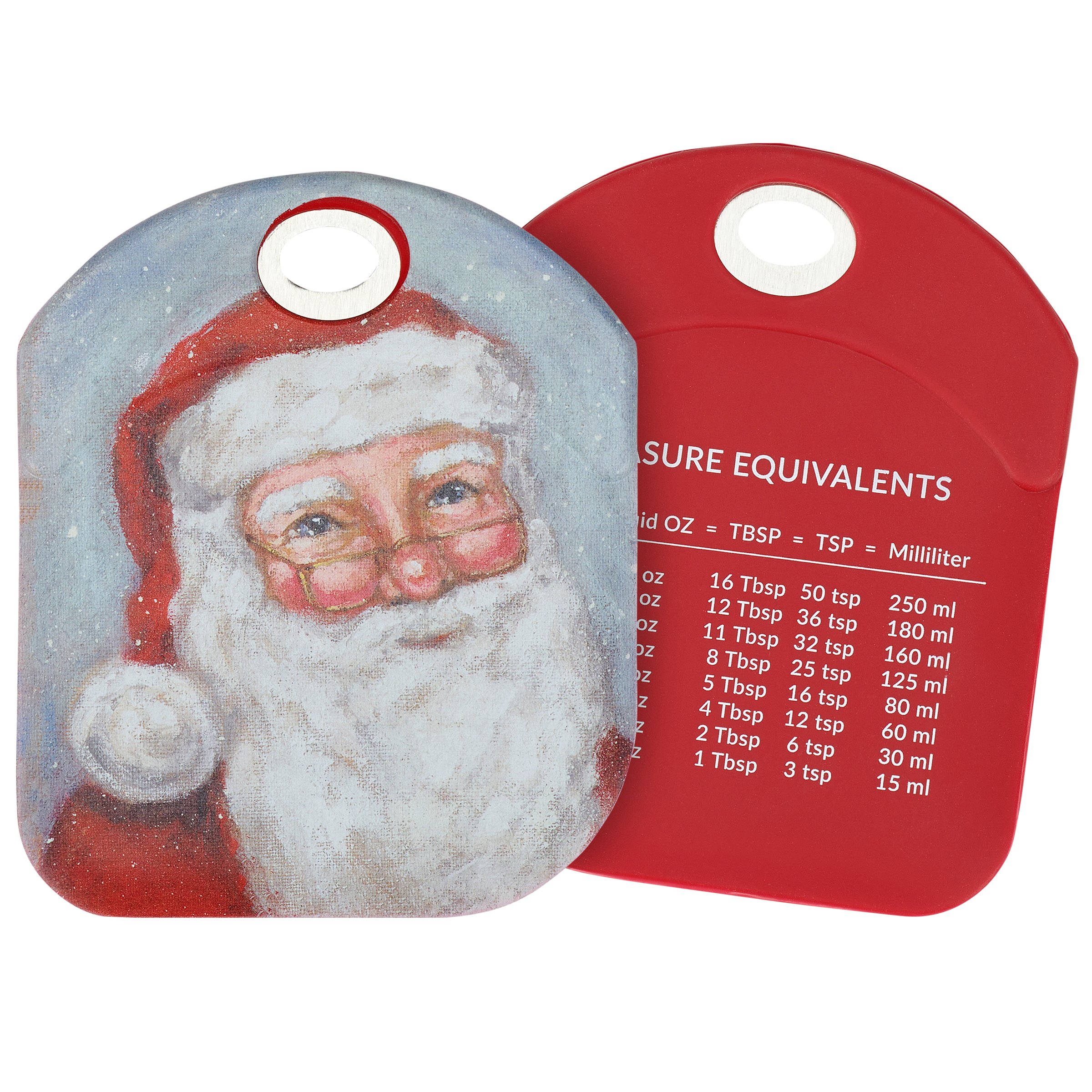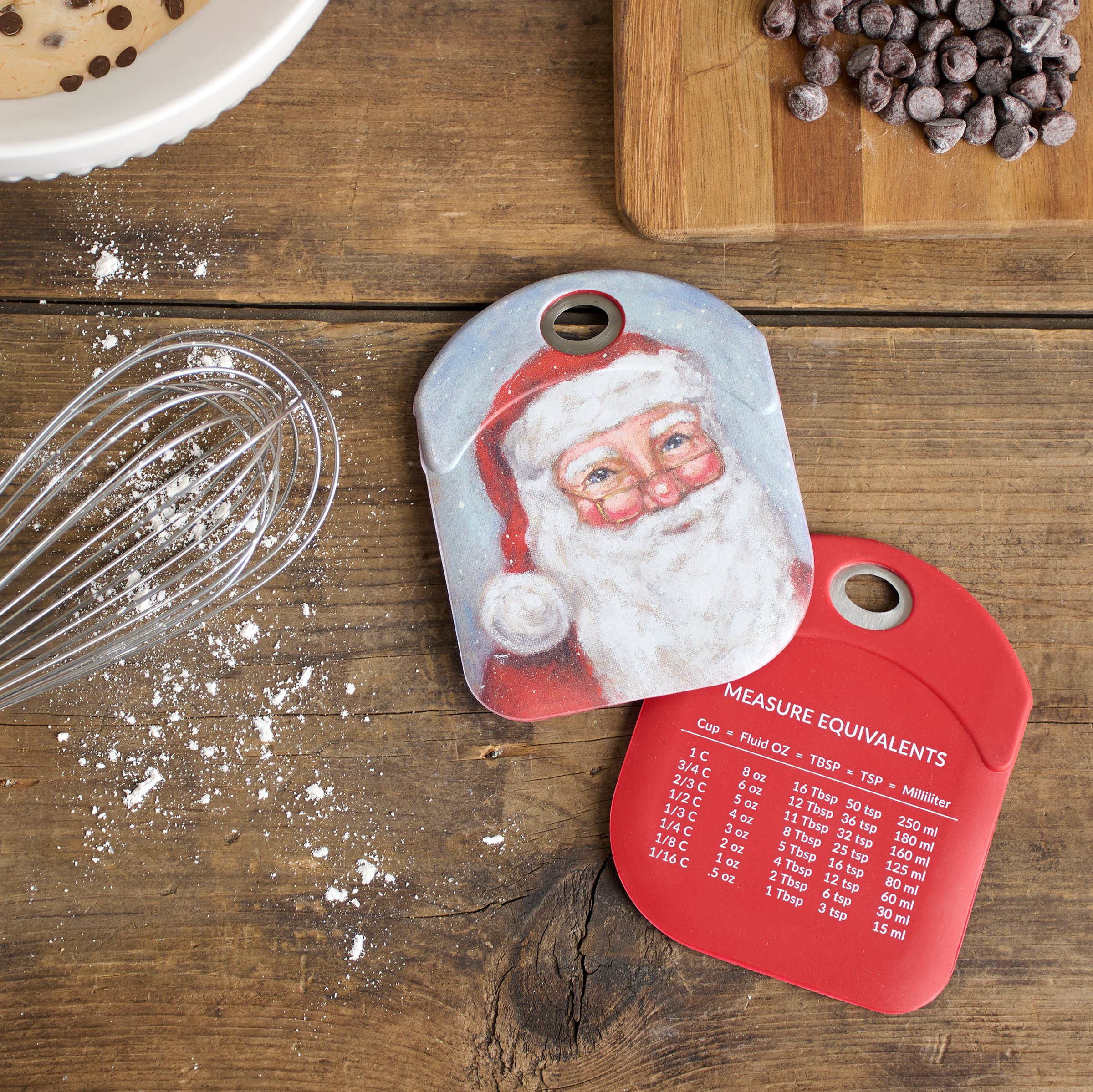 A double-sided silicone bowl scraper from our Christmas Collection displaying a charming winter scene of a Merry Santa. Christmas Santa design is replicated from original artwork painted onto burlap canvas, giving the art a unique depth and texture. Our Merry Santa bowl scraper features a sturdy stainless steel handle and convenient measurement equivalents on the back for easier baking. Silicone bowl scraper is hand wash only. A Santa themed kitchen accessory great for gifting and seasonal baking.