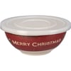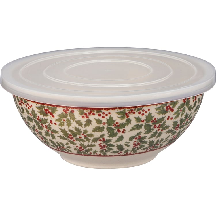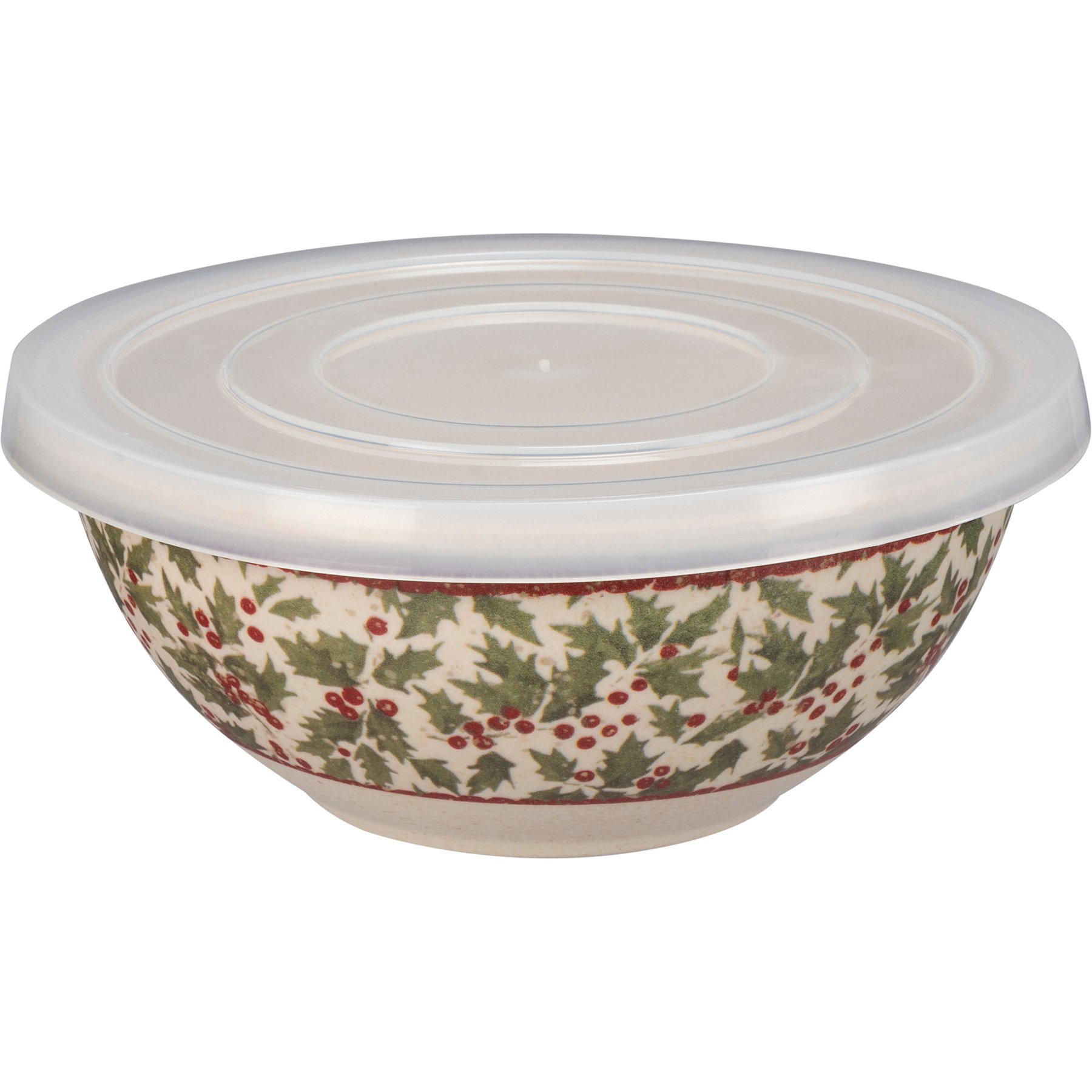 A set of three nesting bamboo bowls with vintage-inspired Christmas designs. Large and small bowls feature wrap-around holly pattern, and medium bowl features double-sided "Merry Christmas" sentiment. Bowls include plastic lids. Dishwasher safe. Not microwave safe.