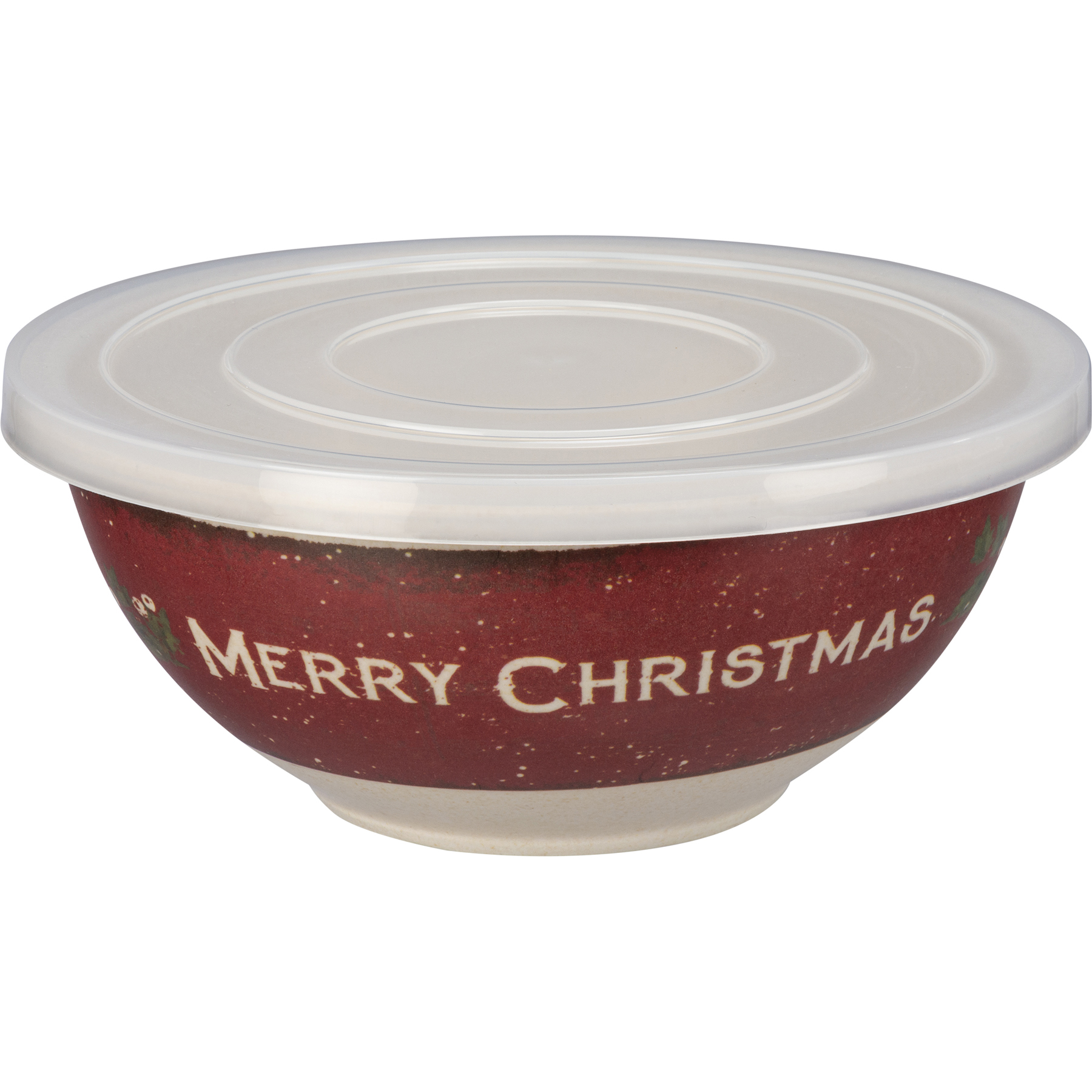 A set of three nesting bamboo bowls with vintage-inspired Christmas designs. Large and small bowls feature wrap-around holly pattern, and medium bowl features double-sided "Merry Christmas" sentiment. Bowls include plastic lids. Dishwasher safe. Not microwave safe.