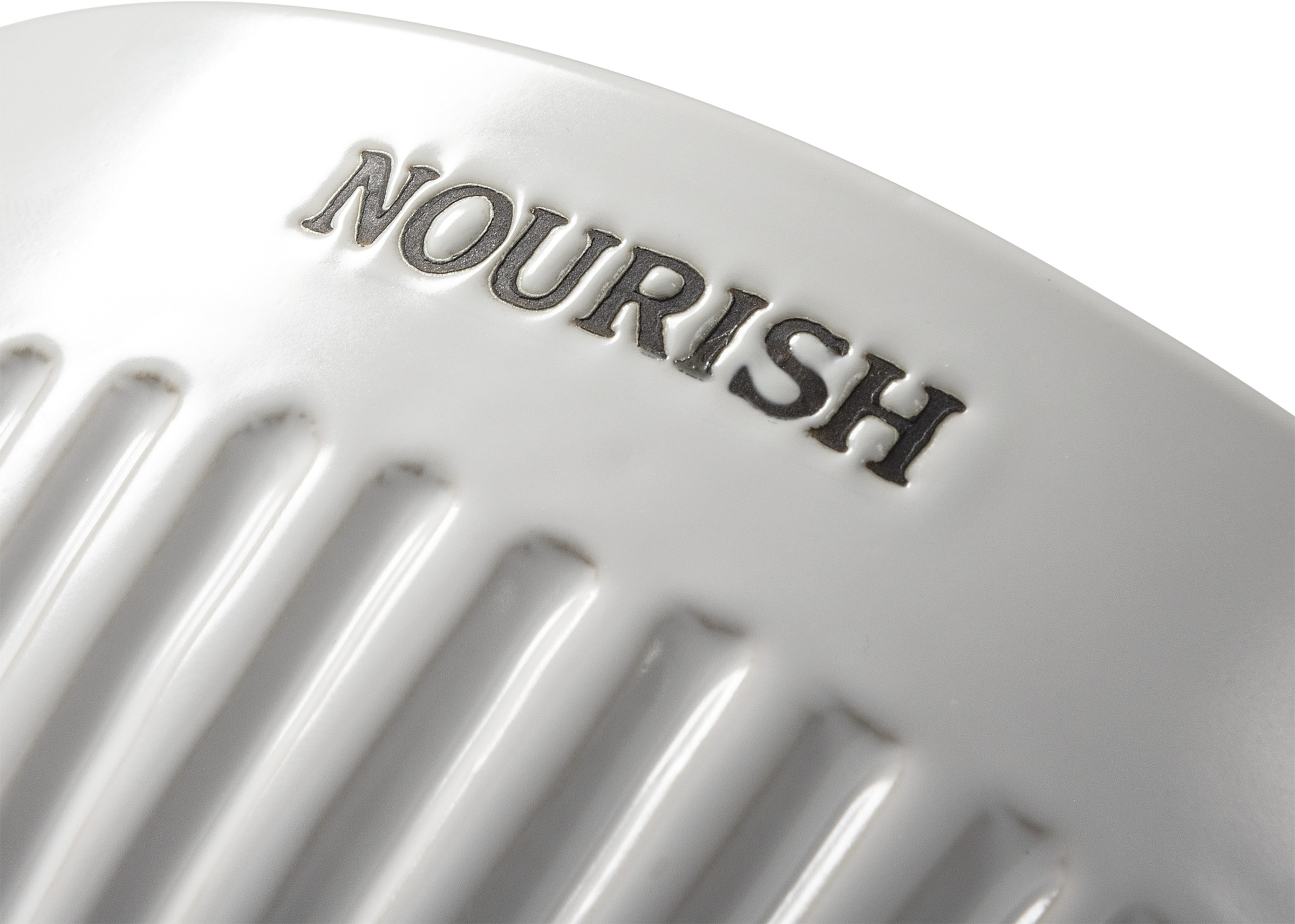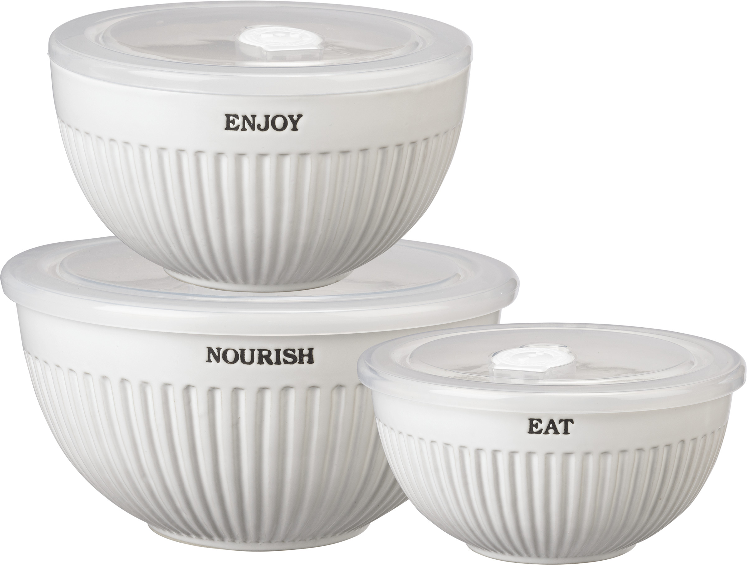 A set of three nesting stoneware bowls. Set includes a small, medium and large white bowl lending debossed "Eat," "Enjoy," and "Nourish" sentiments, respectively. Set features ribbed texture and slate gray text. Each bowl comes with a plastic lid with a rubber seal. Each lid features a date dial to take the guesswork out of keeping track of leftovers. To use, simply set the dial to the number that corresponds to the day of the month when the food is placed in the refrigerator. Microwave, oven, dishwasher and food safe. This set makes a perfect addition to a farmhouse aesthetic and coordinates well with other pieces in collection!