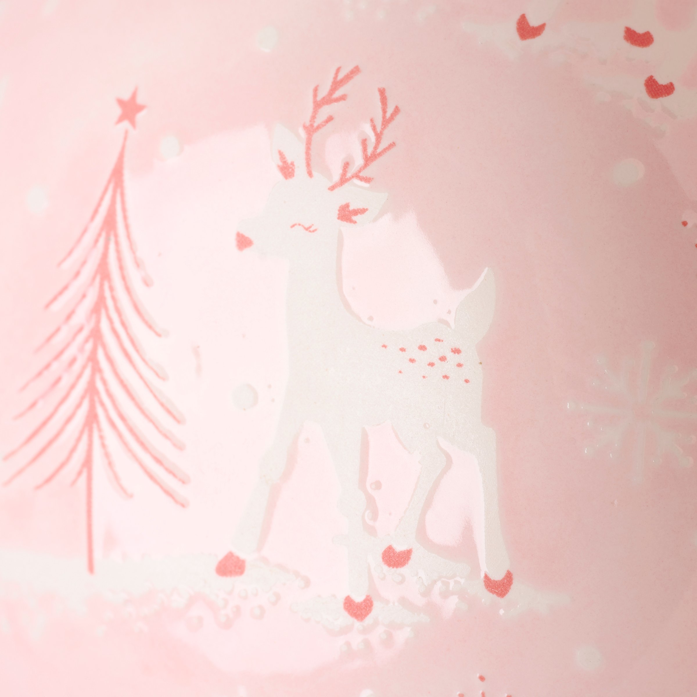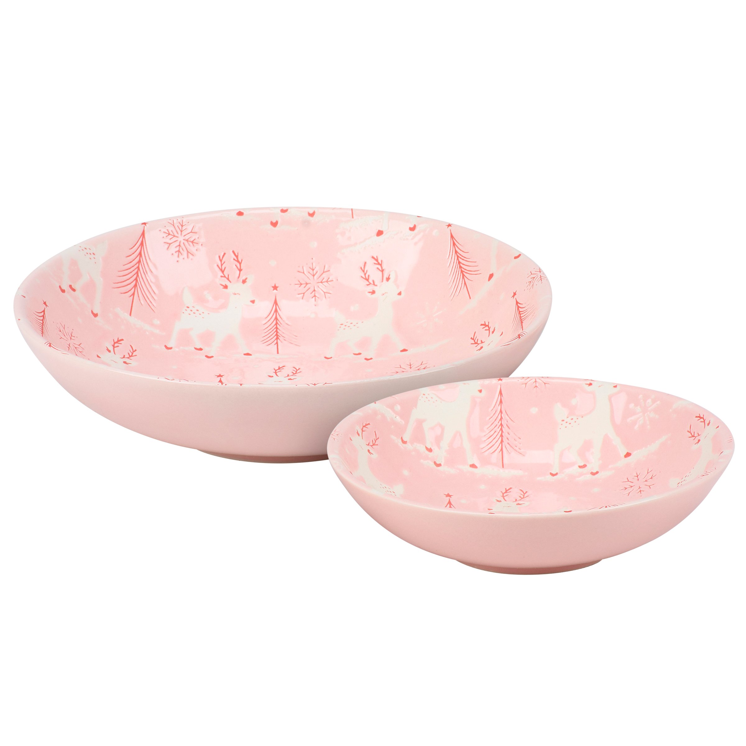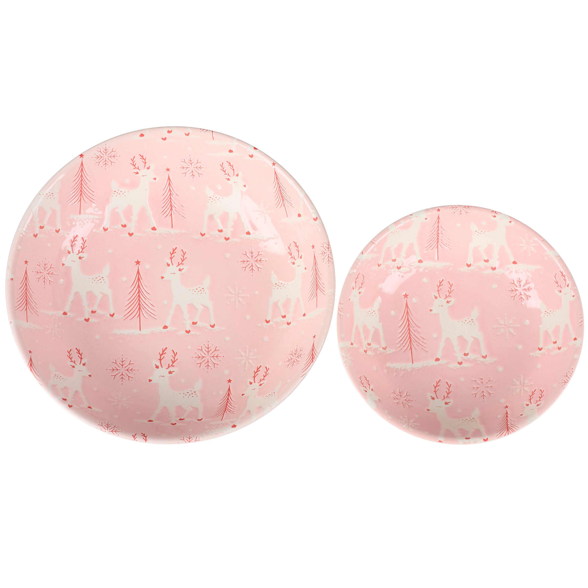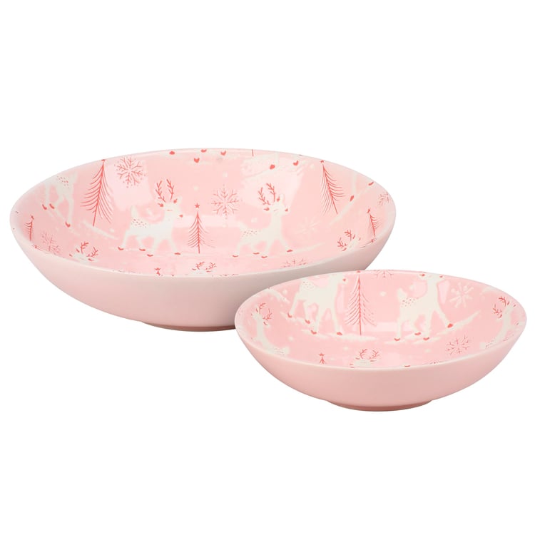 A set of durable ceramic bowls from our Christmas Collection including two different size shallow bowls that nest inside each other for compact storage. Each bowl features a holiday pink pastel color with debossed patterns of reindeer, snowflakes, and Christmas trees inside the bowl. Our Pastel Reindeer bowl set is conveniently microwave, oven, dishwasher, and food safe for easy use. A ceramic set of seasonal dishware perfect for pastel Christmas tablescapes.