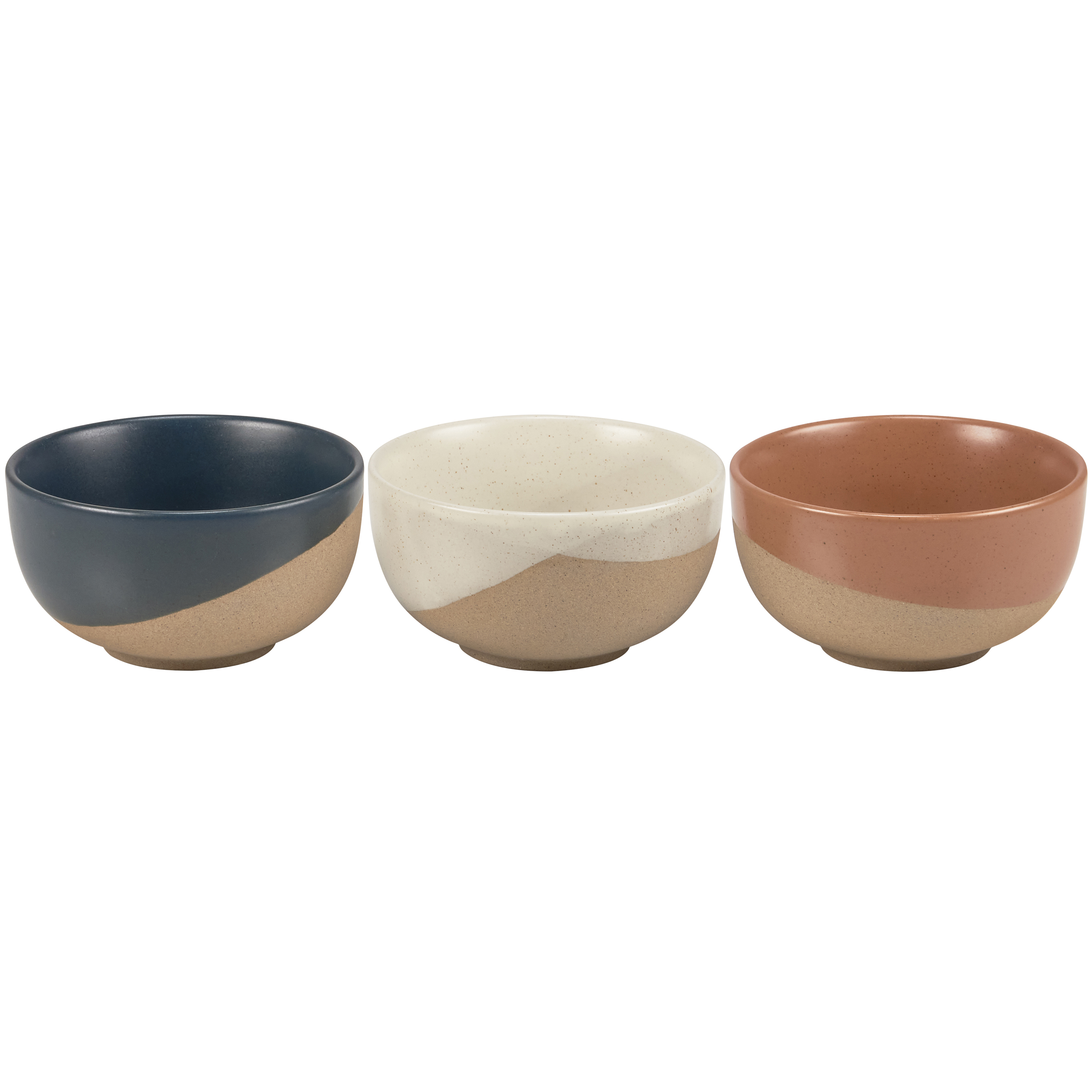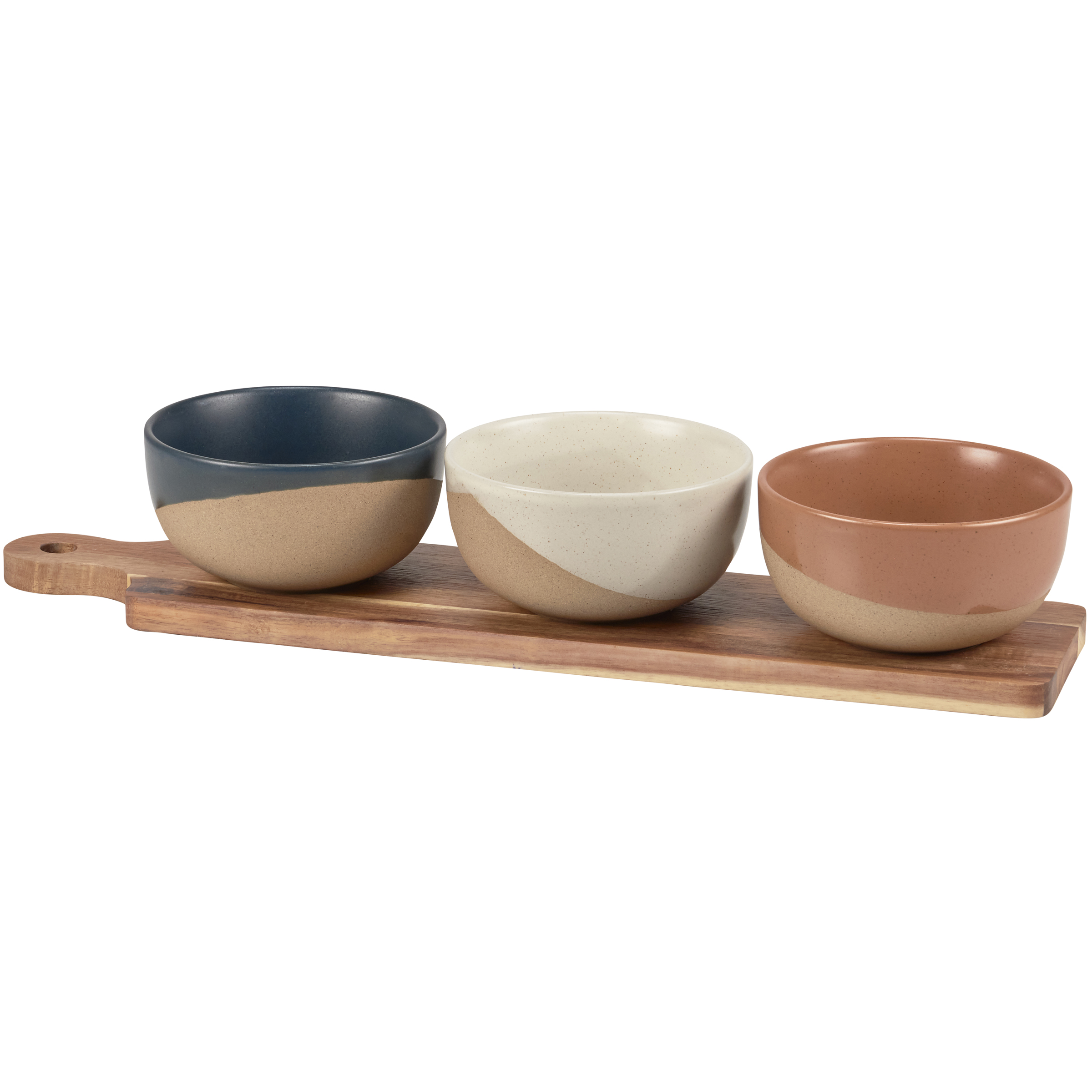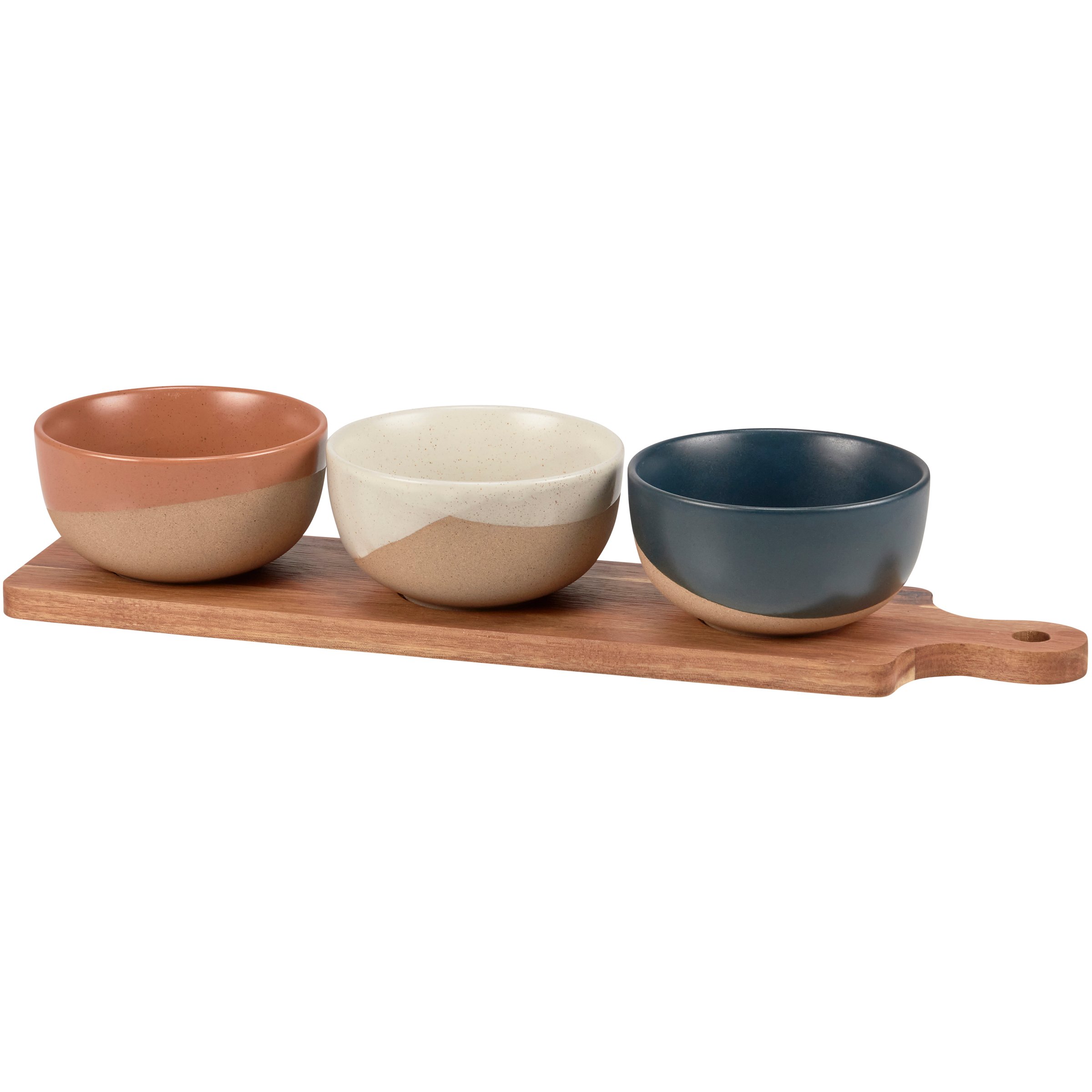A set of 3 durable terracotta bowls with a wooden serving board from ourĀ Tabletop Collection displaying individual colored glaze around the outside and inside each bowl with bare ceramic accents. Our Snack bowl set is ideal for setting out multiple snack options. The included serving board features 3 slots for the bowls to fit nicely without moving. Bowls are microwave, dishwasher, and food safe for convenient use. A stylish set of tableware perfect for everyday gatherings.