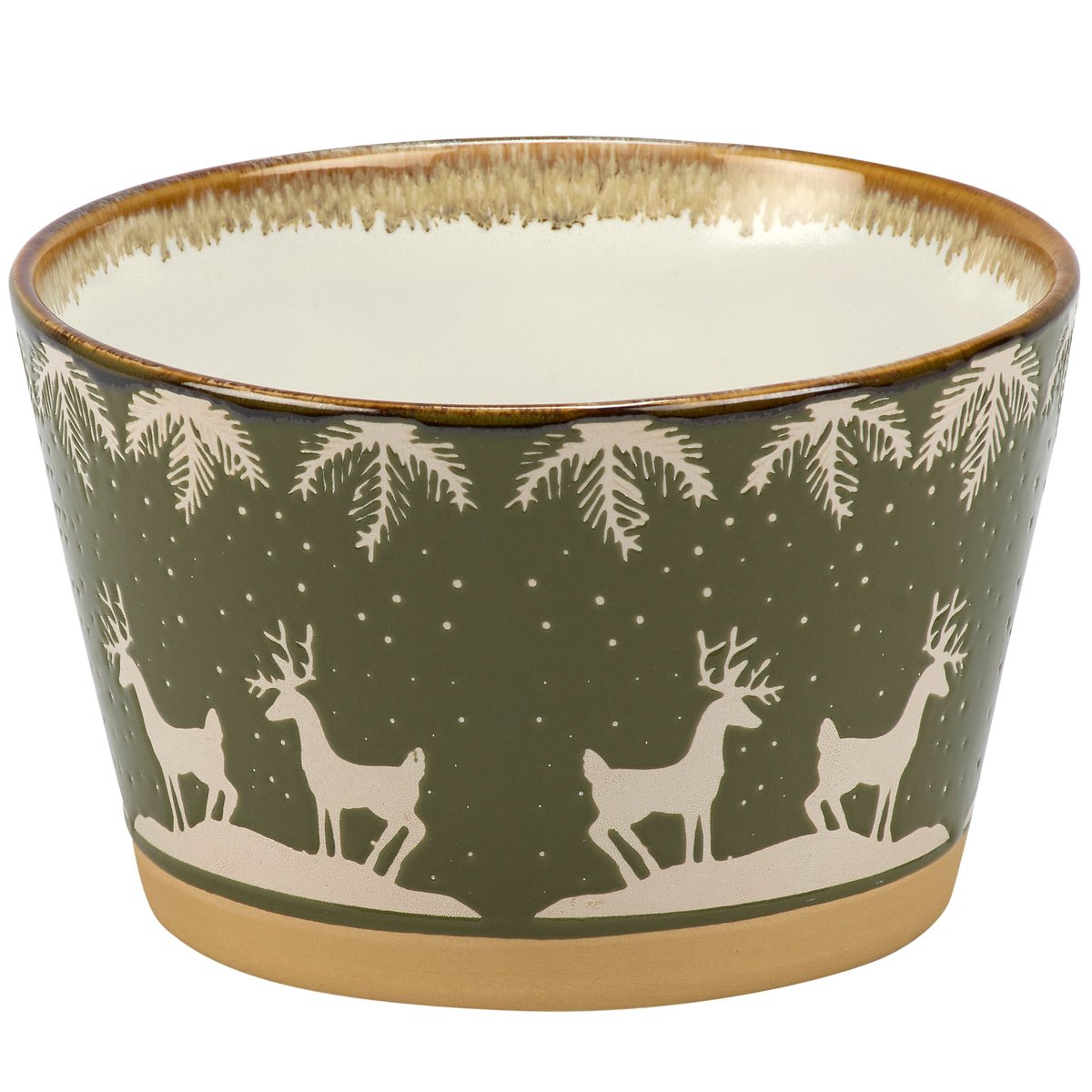 A ceramic bowl from our Christmas Collection displaying a vintage winter pattern of deer in the snow featuring debossed details and glaze finish. Our White Deer bowl can be used as seasonal tableware or home décor. Hand wash only; not microwave safe. A piece of vintage Christmas tableware perfect for seasonal gatherings.