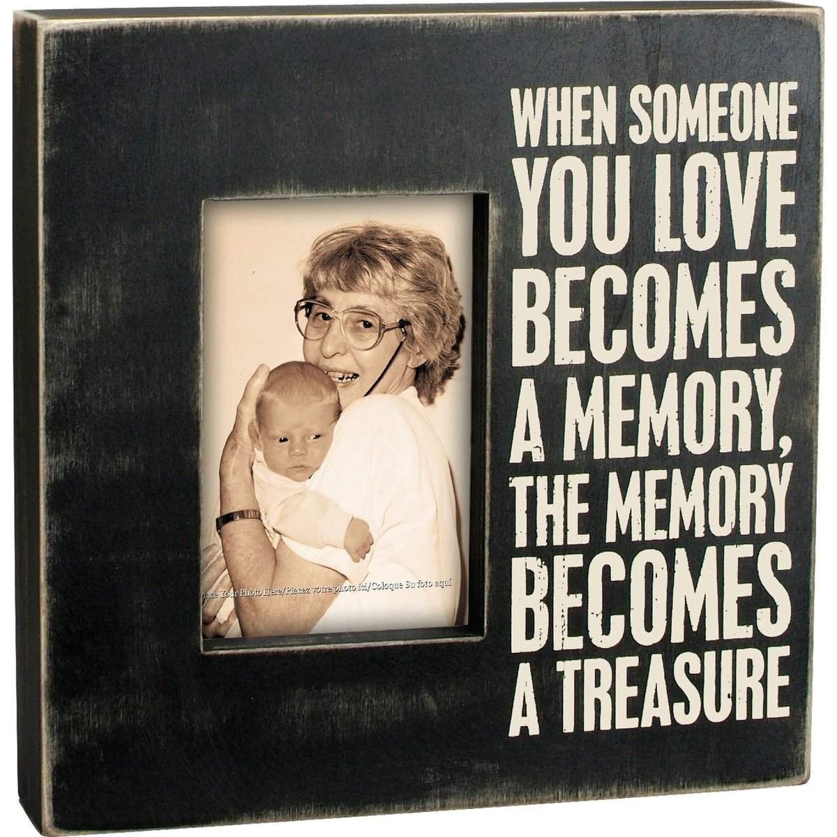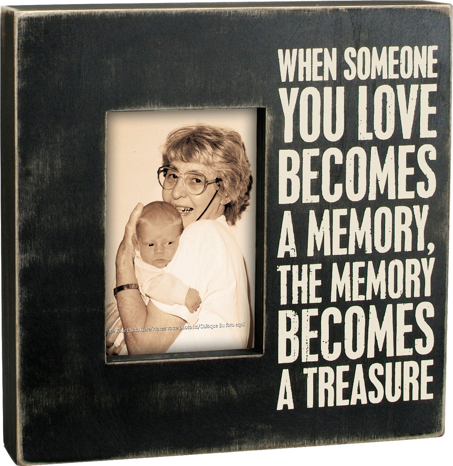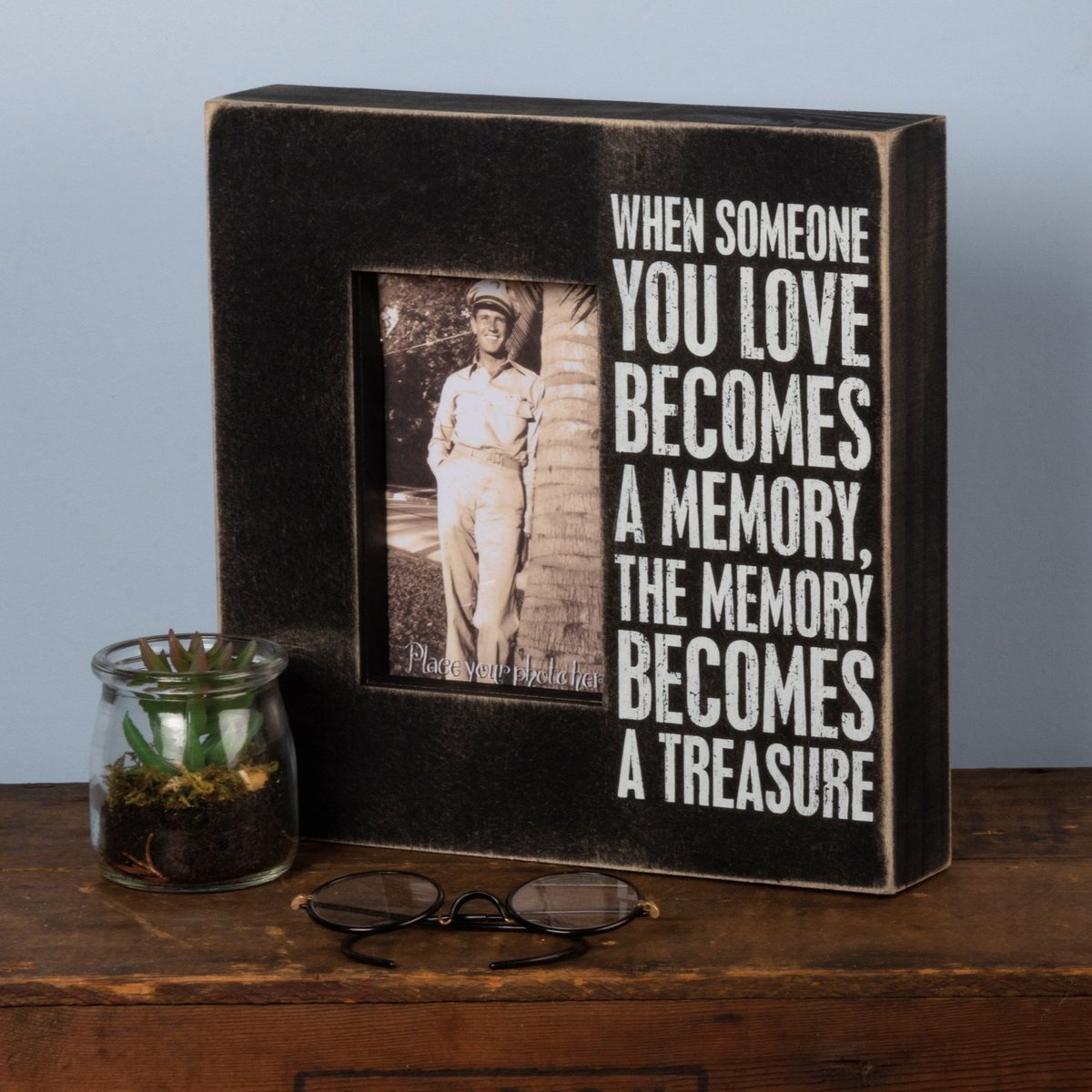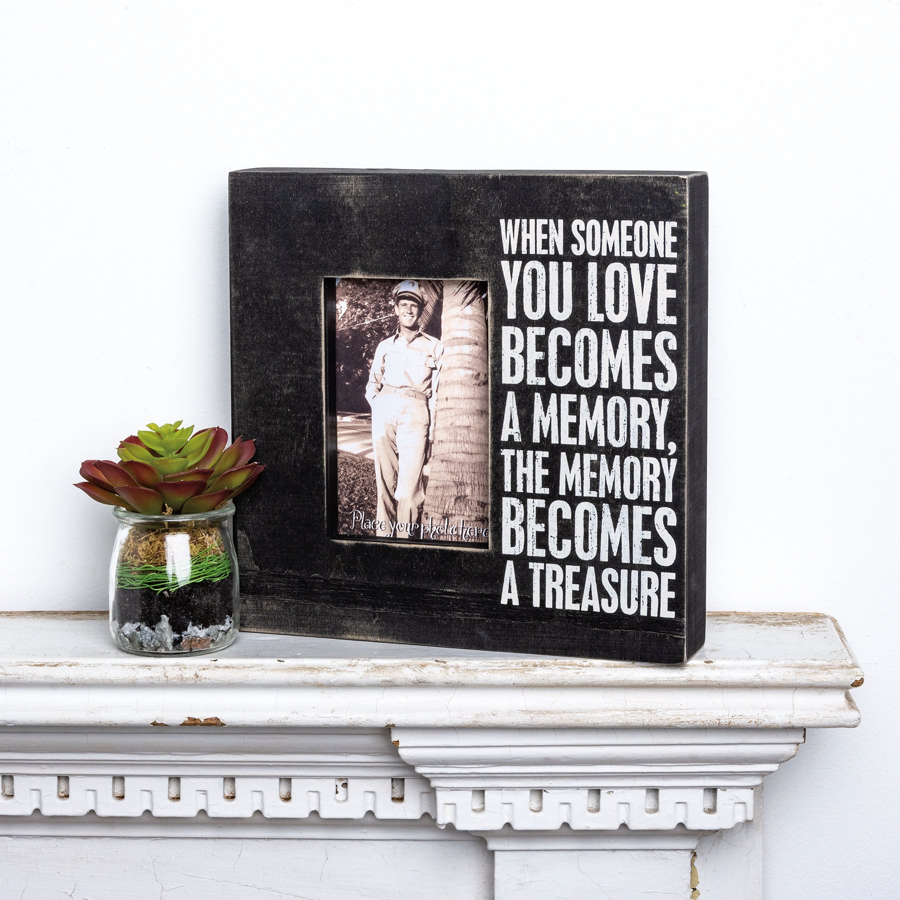 A classic black and white wooden box sign frame lending a distressed "When Someone You Love Becomes A Memory, The Memory becomes A Treasure" sentiment and fits a 4" x 6" photo. Complements well with existing decor and is easy to hang or can free-stand alone.