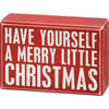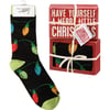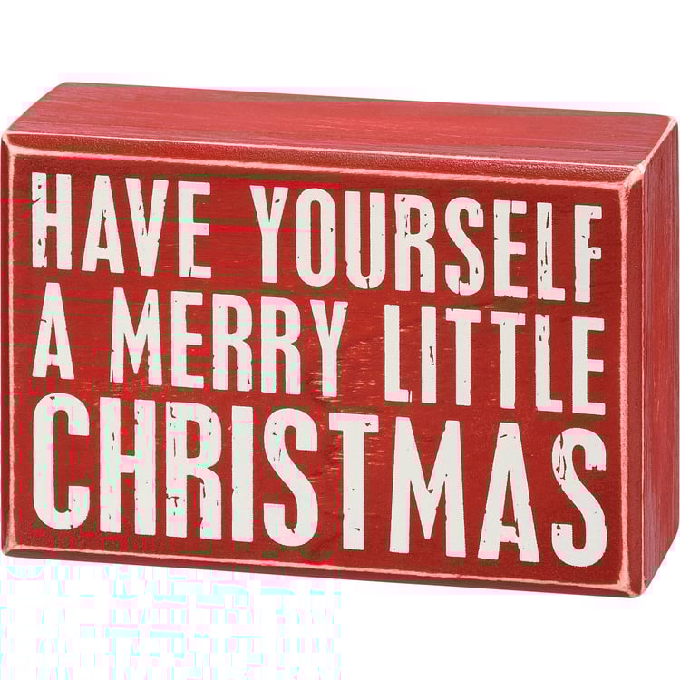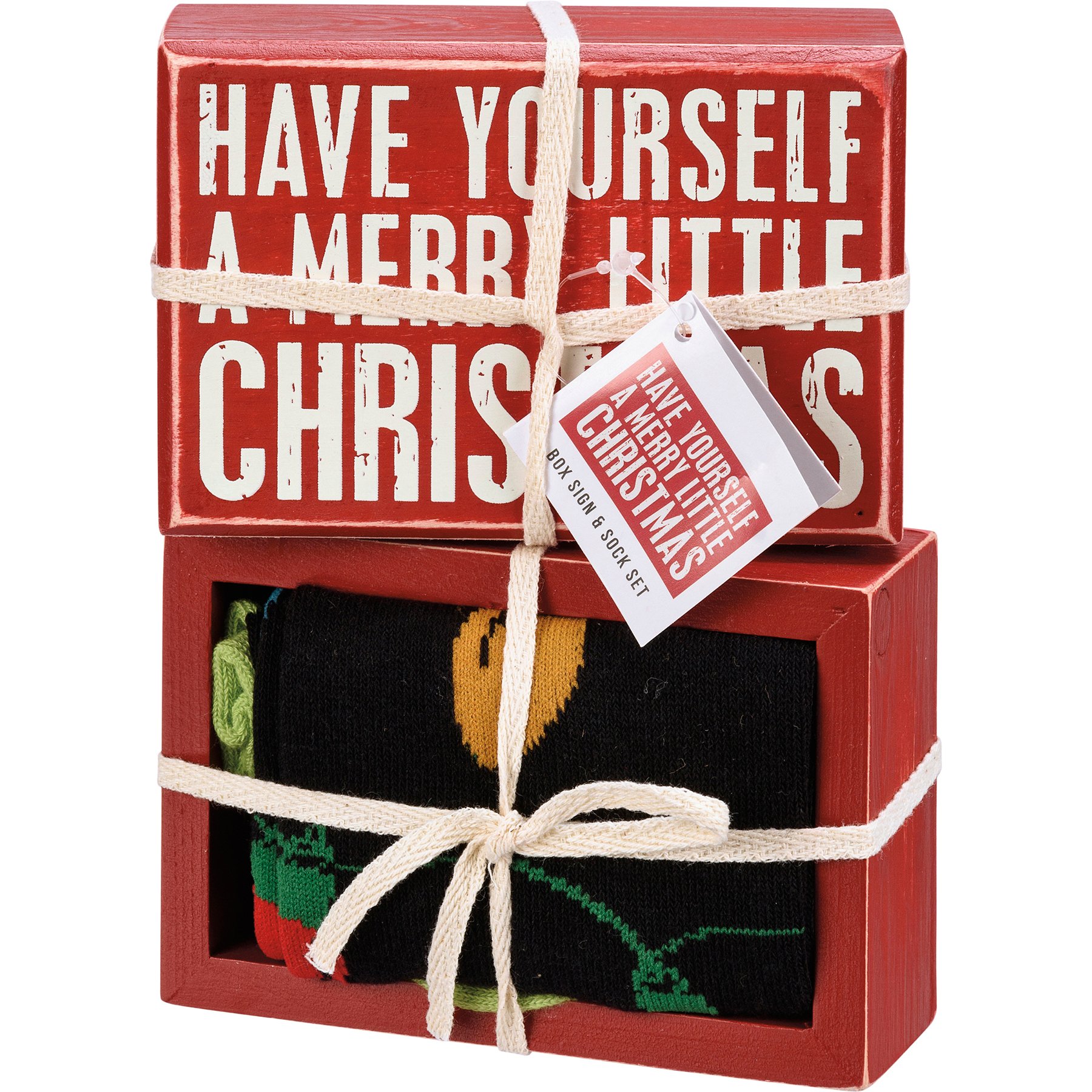 A perfectly giftable set including a box sign with "Have Yourself A Merry Little Christmas" sentiment and a pair of socks featuring coordinating designs. Socks are cotton, nylon, and spandex and are machine-washable. One size fits most. Box sign is easy to hang or can free-stand alone. Socks come neatly rolled inside box sign and secured with tied cotton tape ribbon.