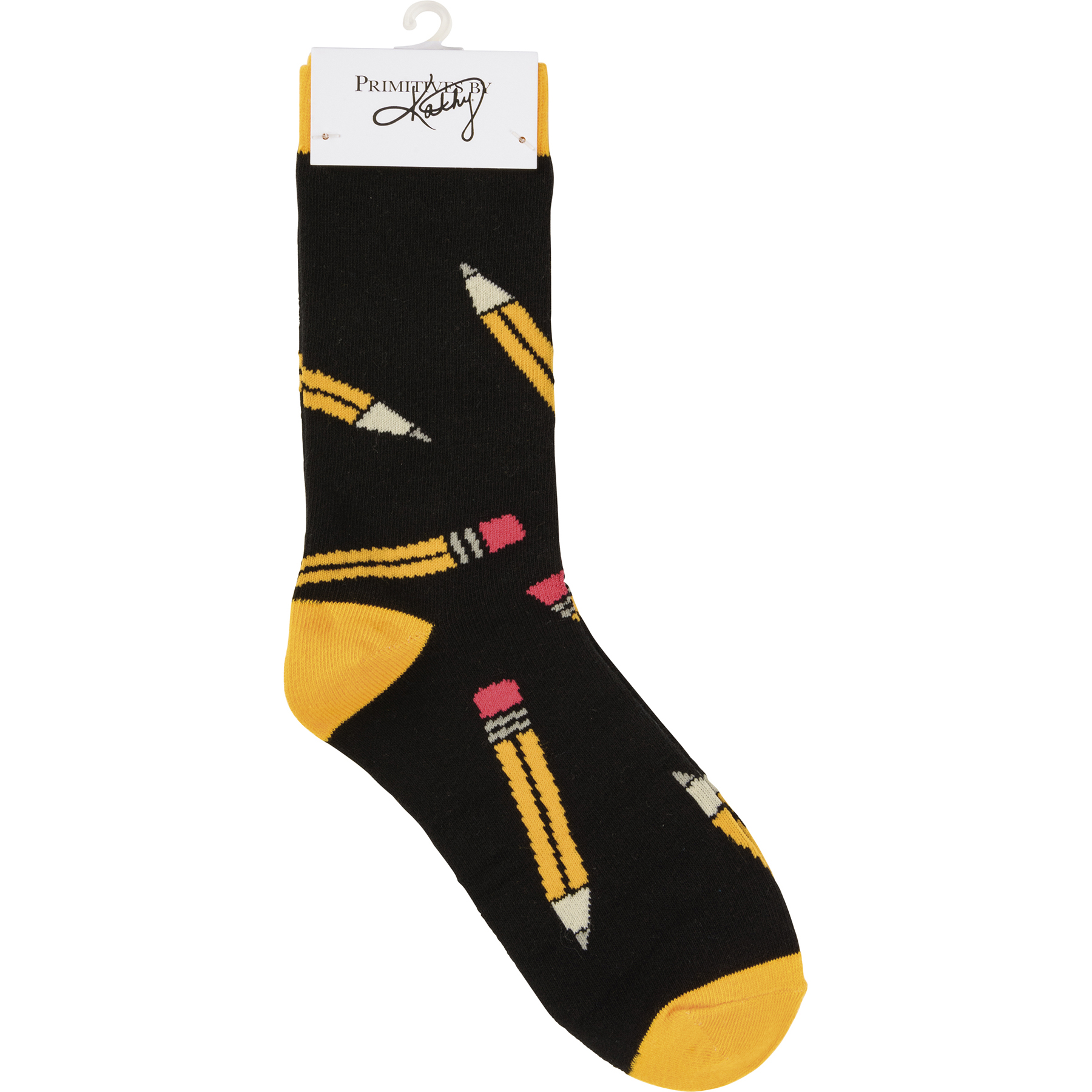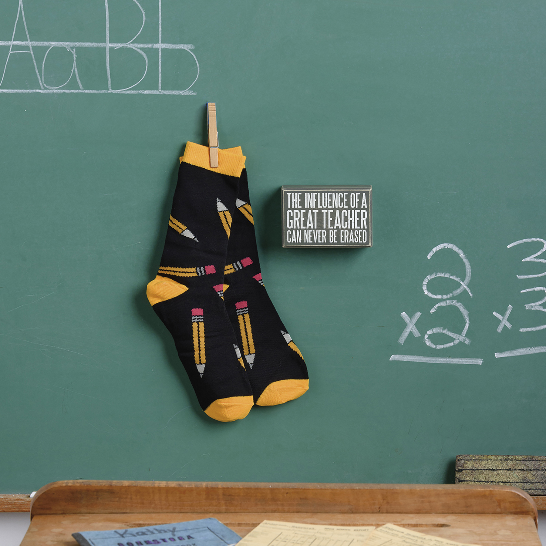 A perfectly giftable set including a box sign featuring a "The Influence Of A Great Teacher Can Never Be Erased" sentiment and a pair of socks with complementing pencil designs. Socks are cotton, nylon, and spandex and are machine-washable. One size fits most. Box sign is easy to hang or can free-stand alone. Socks come neatly rolled inside box sign and secured with tied cotton tape ribbon.