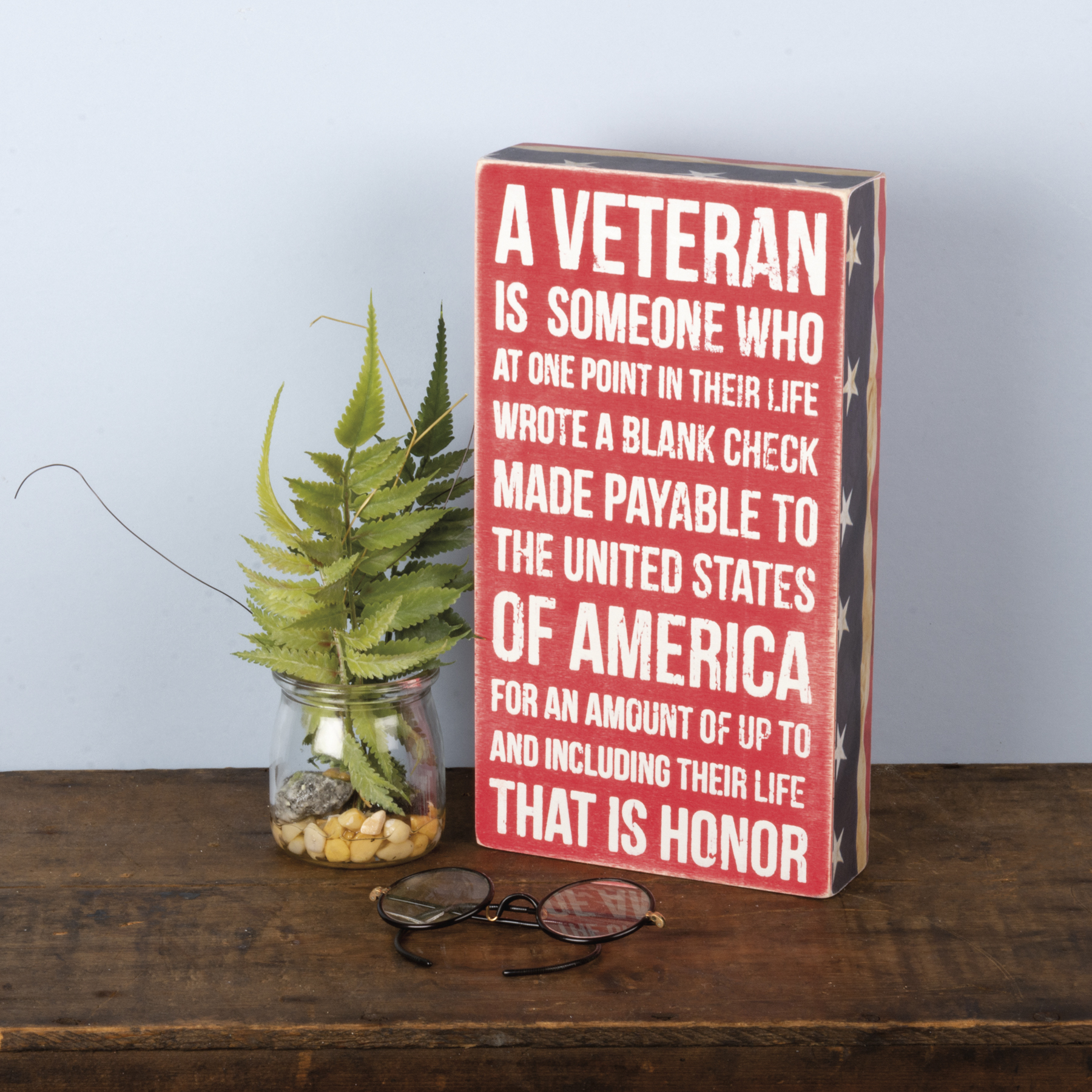 A red, white, and blue wooden box sign featuring a distressed "A Veteran Is Someone Who At One Point In Their Life Wrote A Blank Check Made Payable To The United States Of America For An Amount Of Up To And Including Their Life - That Is Honor" sentiment with stars and stripes trim designs. This veterans sign is easy to hang or can free-stand alone.