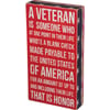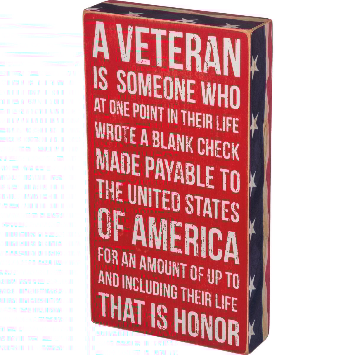 A red, white, and blue wooden box sign featuring a distressed "A Veteran Is Someone Who At One Point In Their Life Wrote A Blank Check Made Payable To The United States Of America For An Amount Of Up To And Including Their Life - That Is Honor" sentiment with stars and stripes trim designs. This veterans sign is easy to hang or can free-stand alone.