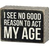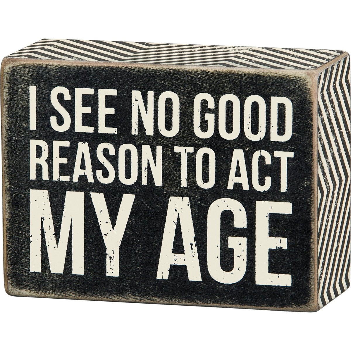 A classic black and white wooden box sign featuring a distressed "I See No Good Reason To Act My Age" sentiment with zigzag trim designs. Easy to hang or can free-stand alone.