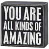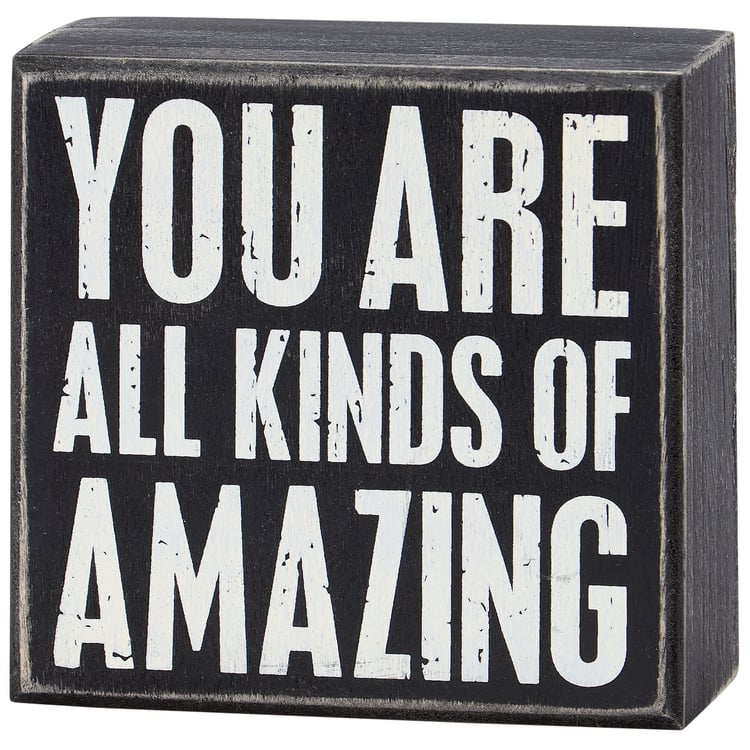 A classic black and white wooden box sign from our Box Sign Collection displaying an inspirational sentiment that reads "You Are All Kinds Of Amazing." Inspirational box sign features distressed details with coordinating black color on sides and back. Our All Kinds Of Amazing box sign is easy to hang or can free-stand alone. An inspirational gift that can be easily displayed in any home or work space.