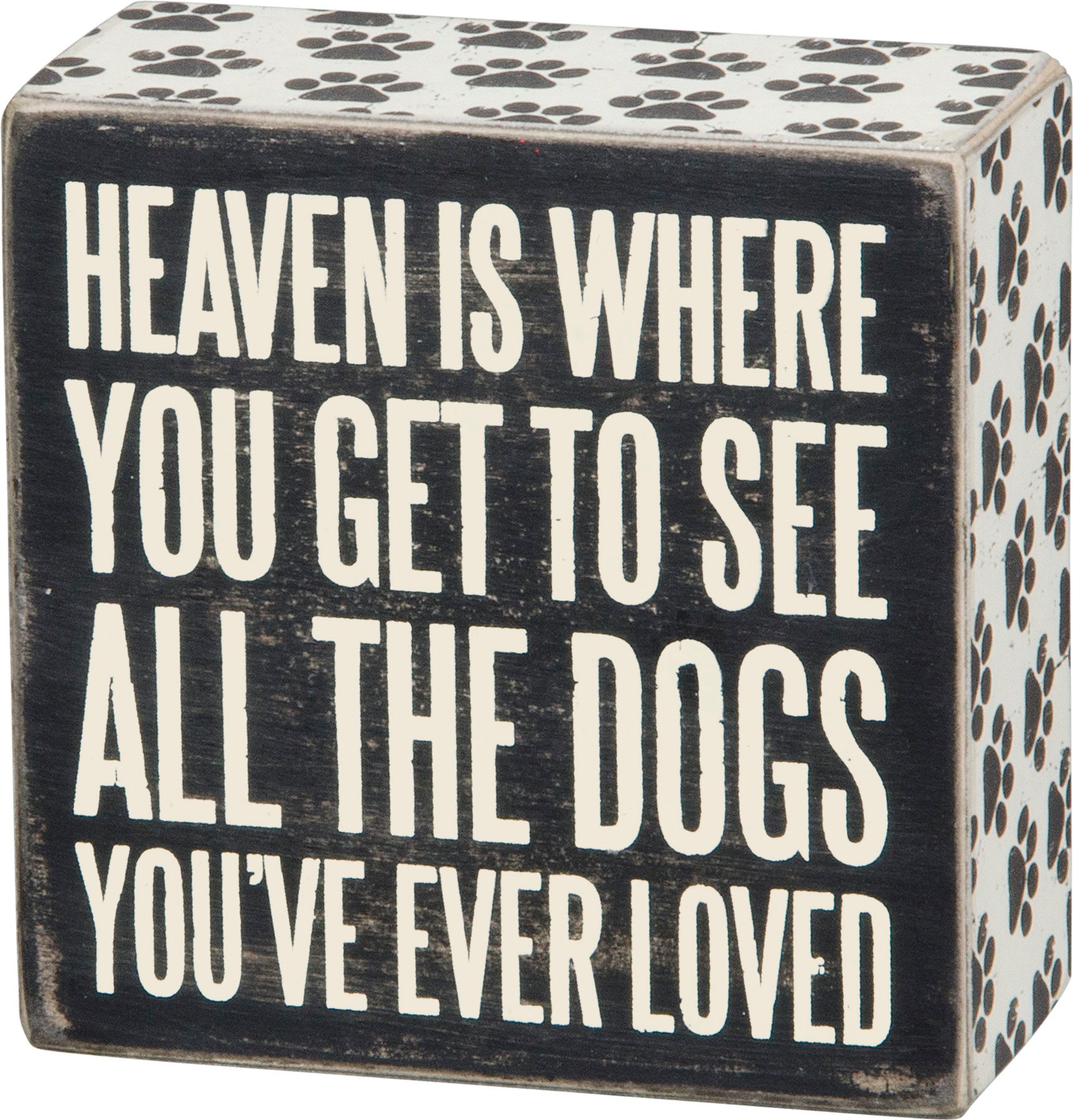 A classic black and white wooden box sign displaying a heartwarming pet inspired sentiment that reads "Heaven Is Where You Get To See All The Dogs You've Ever Loved." Pet box sign features distressed details with a coordinating paw print pattern on the sides. Our All The Dogs box sign is easy to hang or can free-stand alone. A lovely pet-themed gift that can be easily displayed in any home or work space.