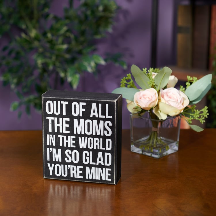 A classic black and white wooden box sign from our Mother's Day Collection displaying a fun mom-themed sentiment that reads "Out Of All The Moms In The World I'm So Glad You're Mine." Mom box sign features distressed details with coordinating black color on sides and back. Our All The Moms box sign is easy to hang or can free-stand alone. A fun Mother's Day gift that can be easily displayed in any home or work space.