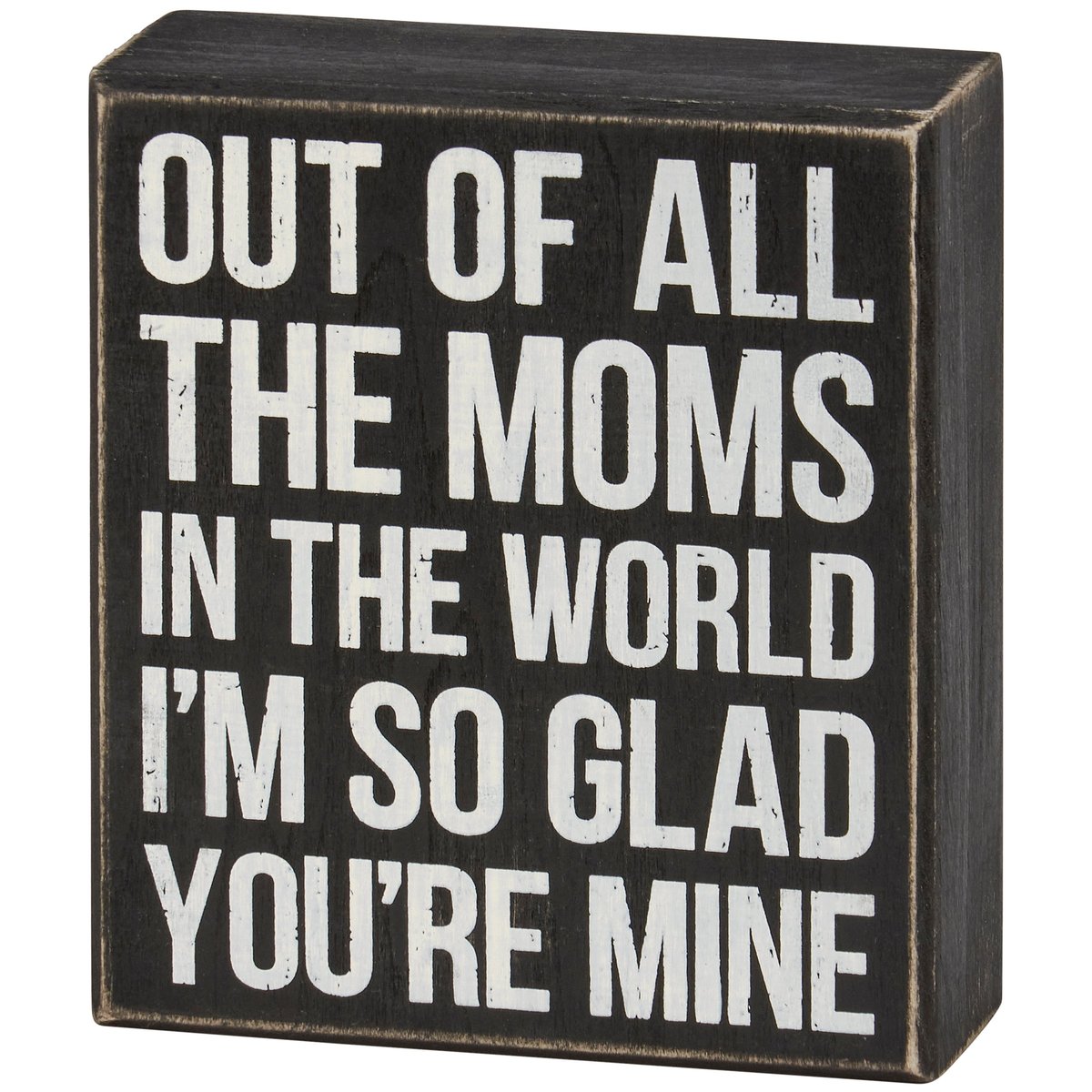 A classic black and white wooden box sign from our Mother's Day Collection displaying a fun mom-themed sentiment that reads "Out Of All The Moms In The World I'm So Glad You're Mine." Mom box sign features distressed details with coordinating black color on sides and back. Our All The Moms box sign is easy to hang or can free-stand alone. A fun Mother's Day gift that can be easily displayed in any home or work space.