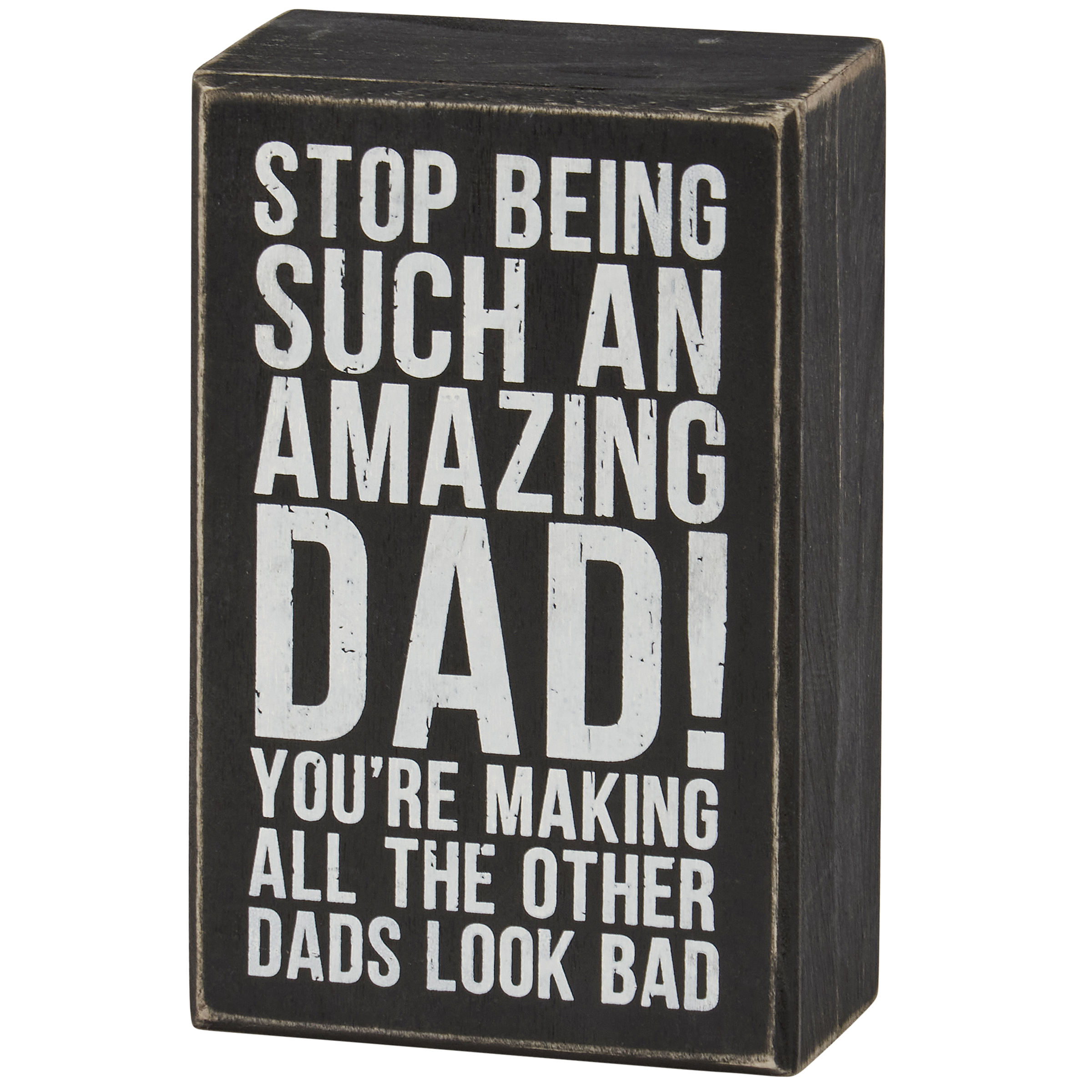 A classic black and white wooden box sign from our Father's Day Collection displaying a fun dad-themed sentiment that reads "Stop Being Such An Amazing Dad! You're Making All The Other Dads Look Bad." Funny dad box sign features distressed details with coordinating black color on sides and back. Our Amazing Dad box sign is easy to hang or can free-stand alone. A fun Father's Day gift that can be easily displayed in any home or work space.