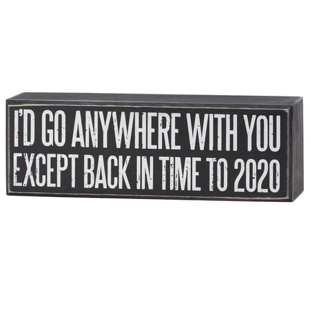 A classic black and white wooden box sign from our Box Sign Collection displaying a fun love-themed sentiment that reads "I'd Go Anywhere With You Except Back In Time To 2020." Funny box sign features distressed details with coordinating black color on sides and back. Our Anywhere With You Except box sign is easy to hang or can free-stand alone. A funny gift that can be easily displayed in any home or work space.