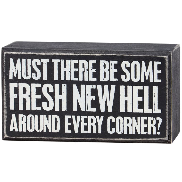 A classic black and white wooden box sign from our Box Sign Collection displaying a fun sentiment that reads "Must There Be Some Fresh New Hell Around Every Corner?" Funny box sign features distressed details with coordinating black color on sides and back. Our Around Every Corner box sign is easy to hang or can free-stand alone. A funny gift that can be easily displayed in any home or work space.