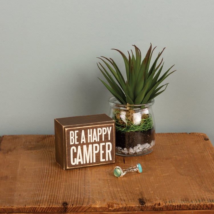 A wooden box sign featuring a distressed "Be A Happy Camper" sentiment that complements well with existing decor. Easy to hang or can free-stand alone.