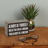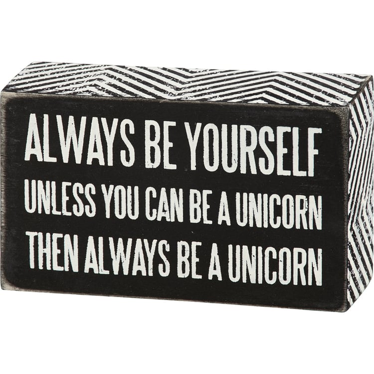 A classic black and white wooden box sign featuring a distressed "Always Be Yourself - Unless You Can Be A Unicorn Then Always Be A Unicorn" sentiment with zigzag trim designs. Easy to hang or can free-stand alone.