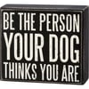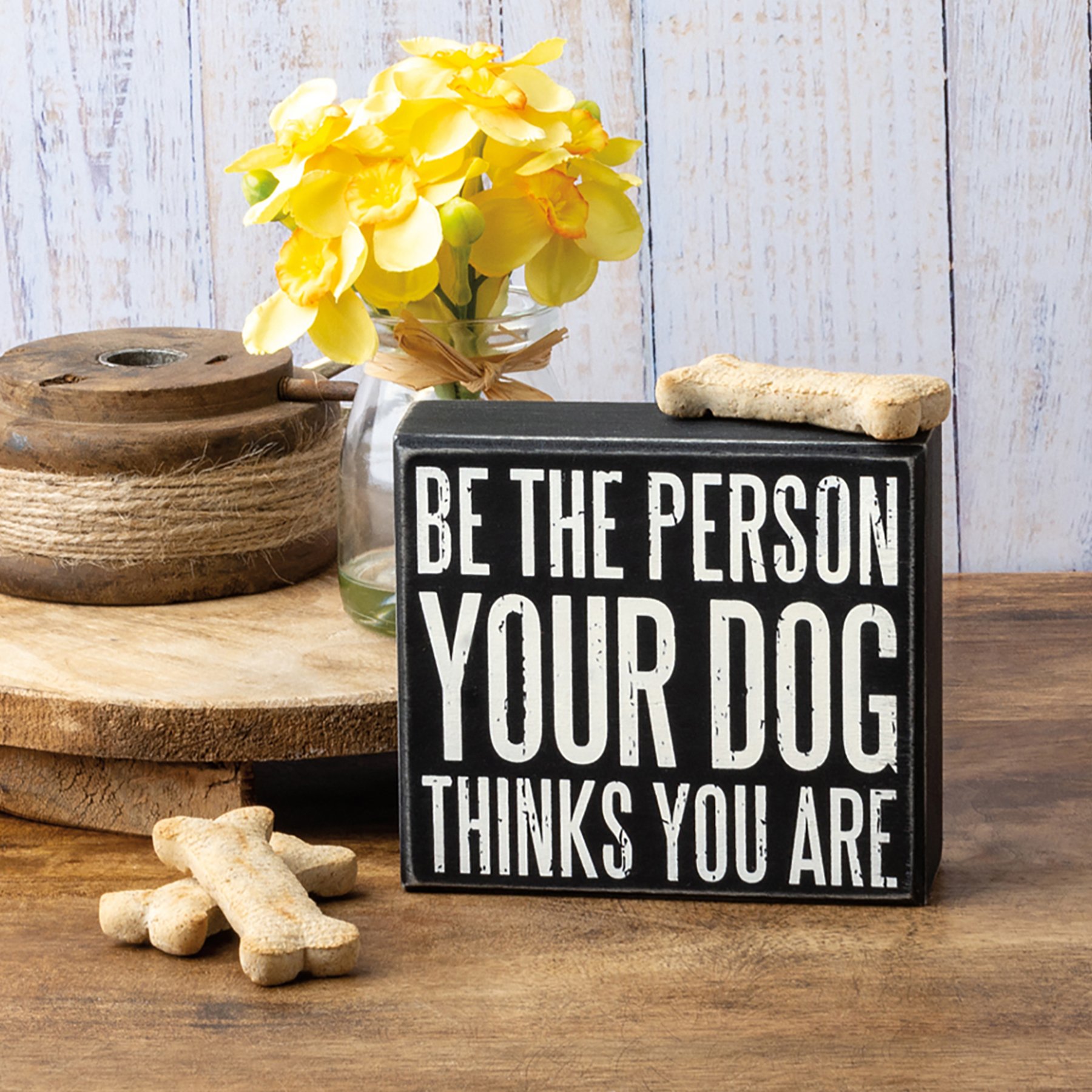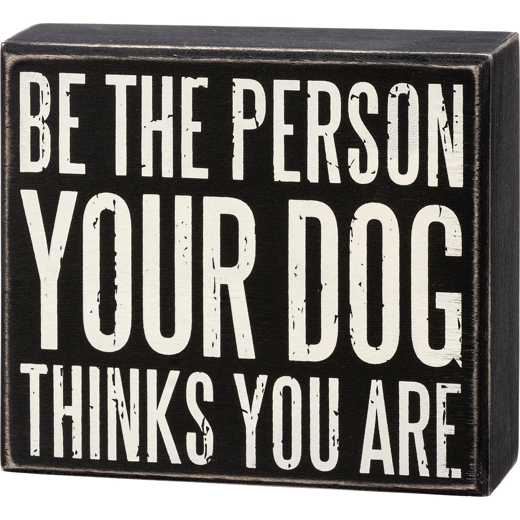 A classic black and white box sign featuring a distressed "Be The Person Your Dog Thinks You Are" sentiment. Our Be The Person box sign is easy to hang or can free-stand alone.