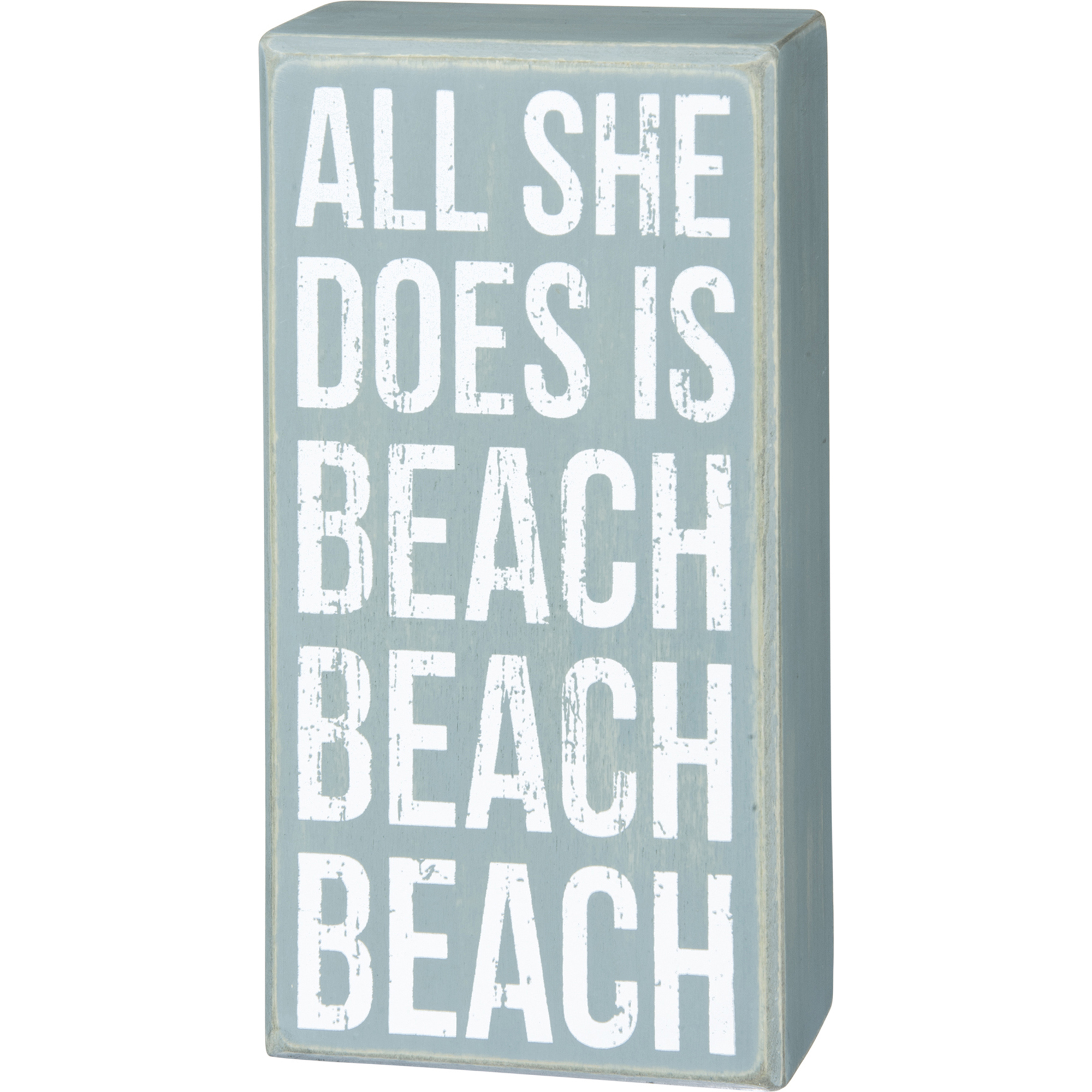A wooden box sign featuring a distressed "All She Does Is Beach Beach Beach" sentiment in a beach-inspired palette. Complements well with existing decor or coordinating design pieces. Easy to hang or can free-stand alone on a shelf or mantel.