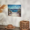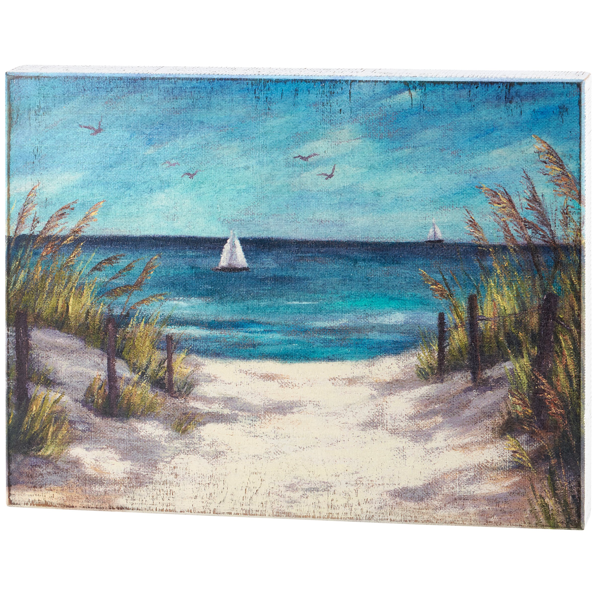A wooden box sign from our Beach Collection displaying a hand painted scene of a beach path with a sailboat in the distance. Design is replicated from original artwork painted onto burlap canvas, giving the art a unique depth and texture. Box sign features distressed details with coordinating white color on the sides and back. Our Beach Path box sign is easy to hang or can free-stand alone. A charming beach-themed home accent with a variety of display options.