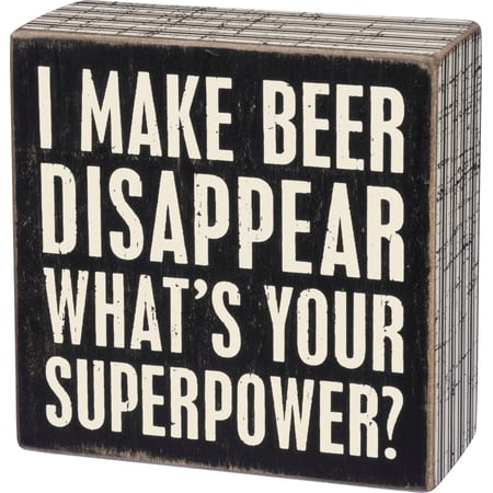 A classic black and white wooden box sign lending a distressed "I Make Beer Disappear - What's Your Superpower?" sentiment with stripe patterned trim. Easy to hang or can free-stand alone.