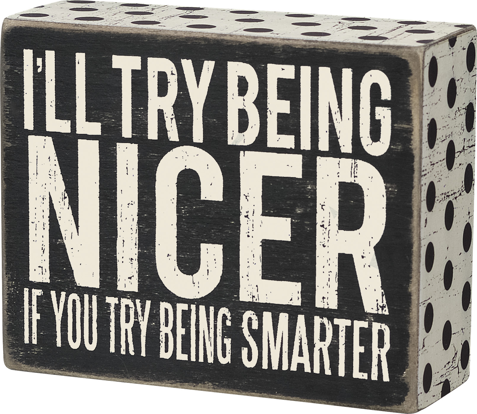 A classic black and white wooden box sign featuring a distressed "I'll Try Being Nicer If You Try Being Smarter" sentiment with polka dot trim designs. Easy to hang or can free-stand alone.