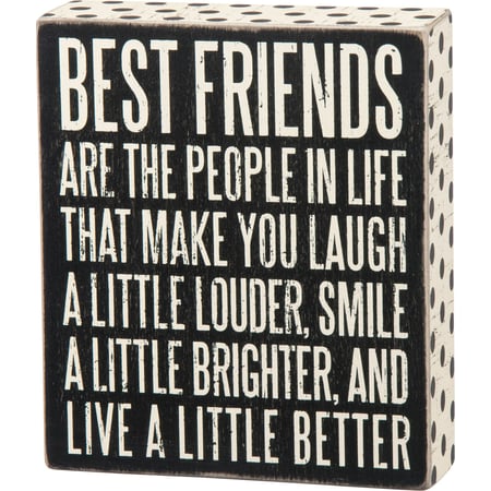 A classic black and white wooden box sign featuring a distressed "Best Friends Are The People In Life That Make You Laugh A Little Louder, Smile A Little Brighter, And Live A Little Better" sentiment with polka dot trim designs. Easy to hang or can free-stand alone.