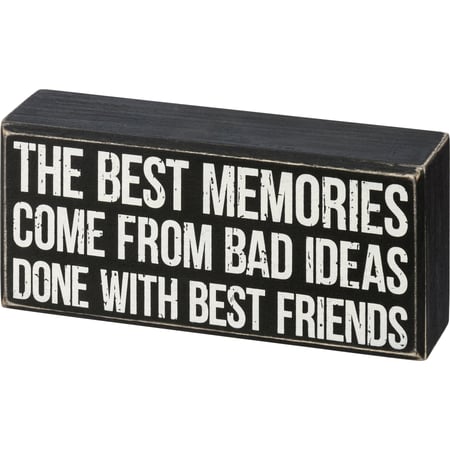 A classic black and white wooden box sign featuring a distressed "The Best Memories Come From Bad Ideas Done With Best Friends" sentiment. Easy to hang or can free-stand alone.