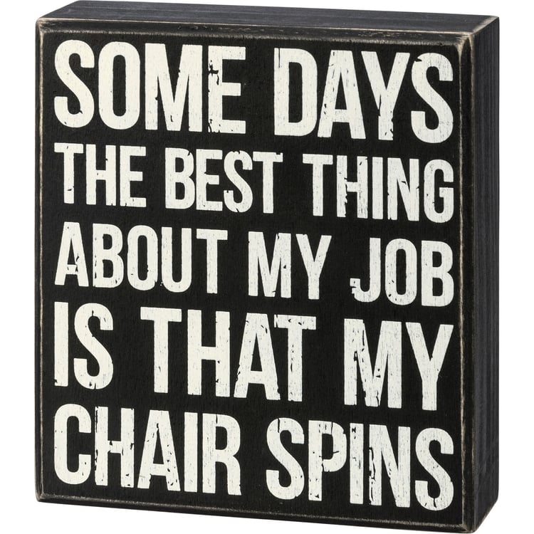A classic black and white wooden box sign featuring a distressed "Some Days The Best Thing About My Job Is That My Chair Spins" sentiment. Easy to hang or can free-stand alone.