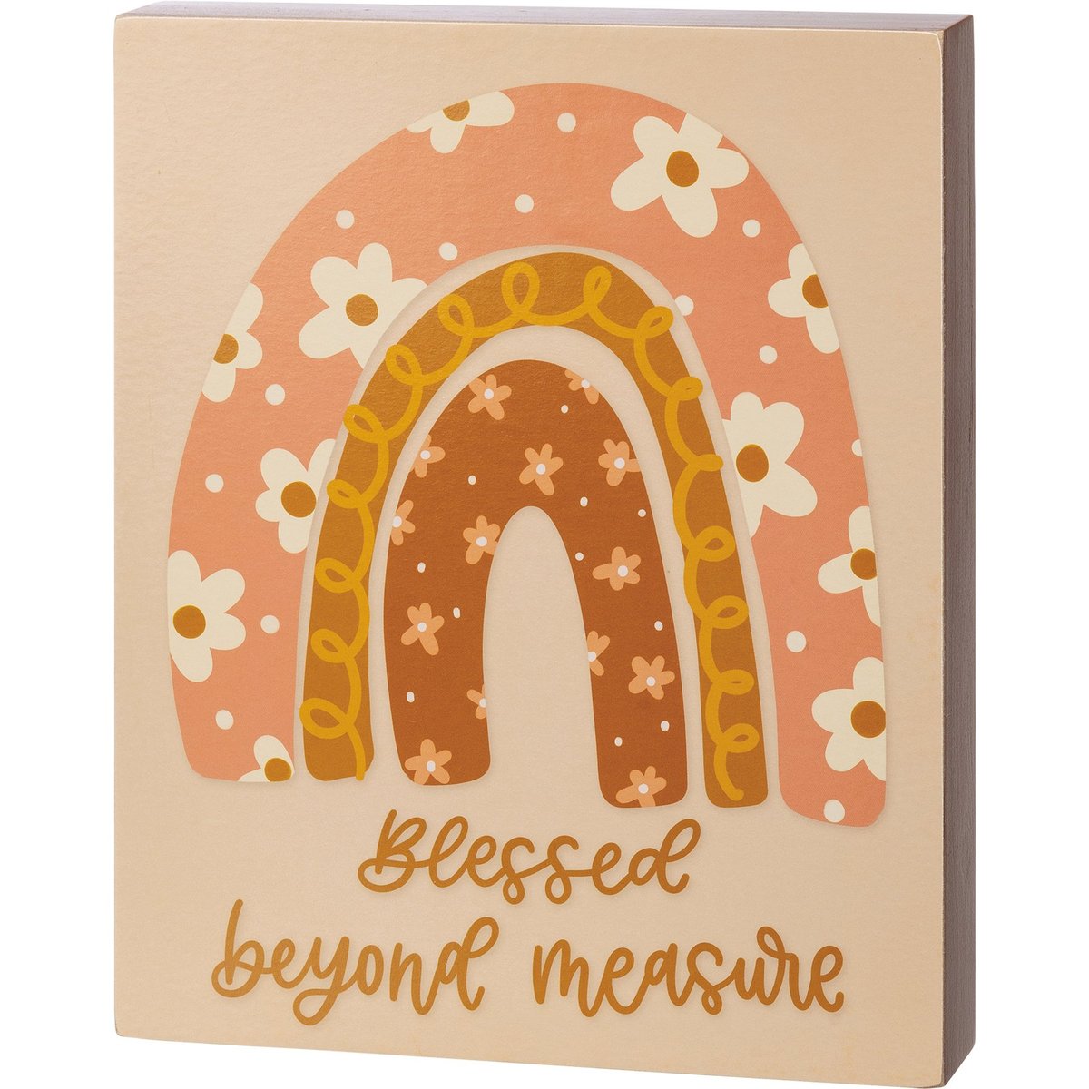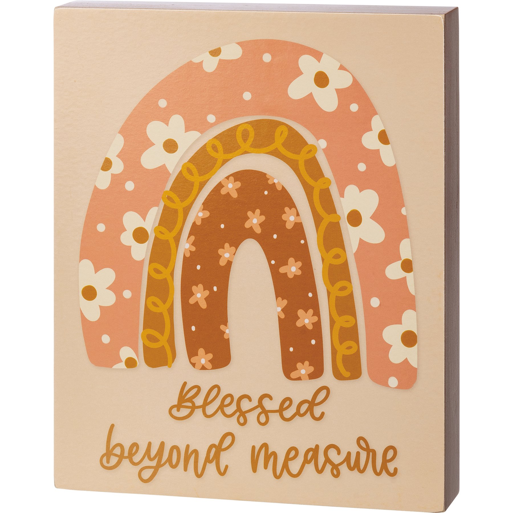 A wooden box sign from our Bohemian Collection featuring "Blessed Beyond Measure" sentiment with floral and rainbow designs. Our Blessed Beyond Measure sign is easy to hang or can free-stand alone. Sides feature coordinating color for added interest.