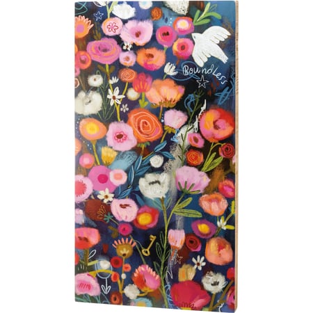 A large wood sign featuring vibrant floral designs and inspirational "Boundless" sentiment. Wooden wall art is easy to hang and makes a perfect statement piece.