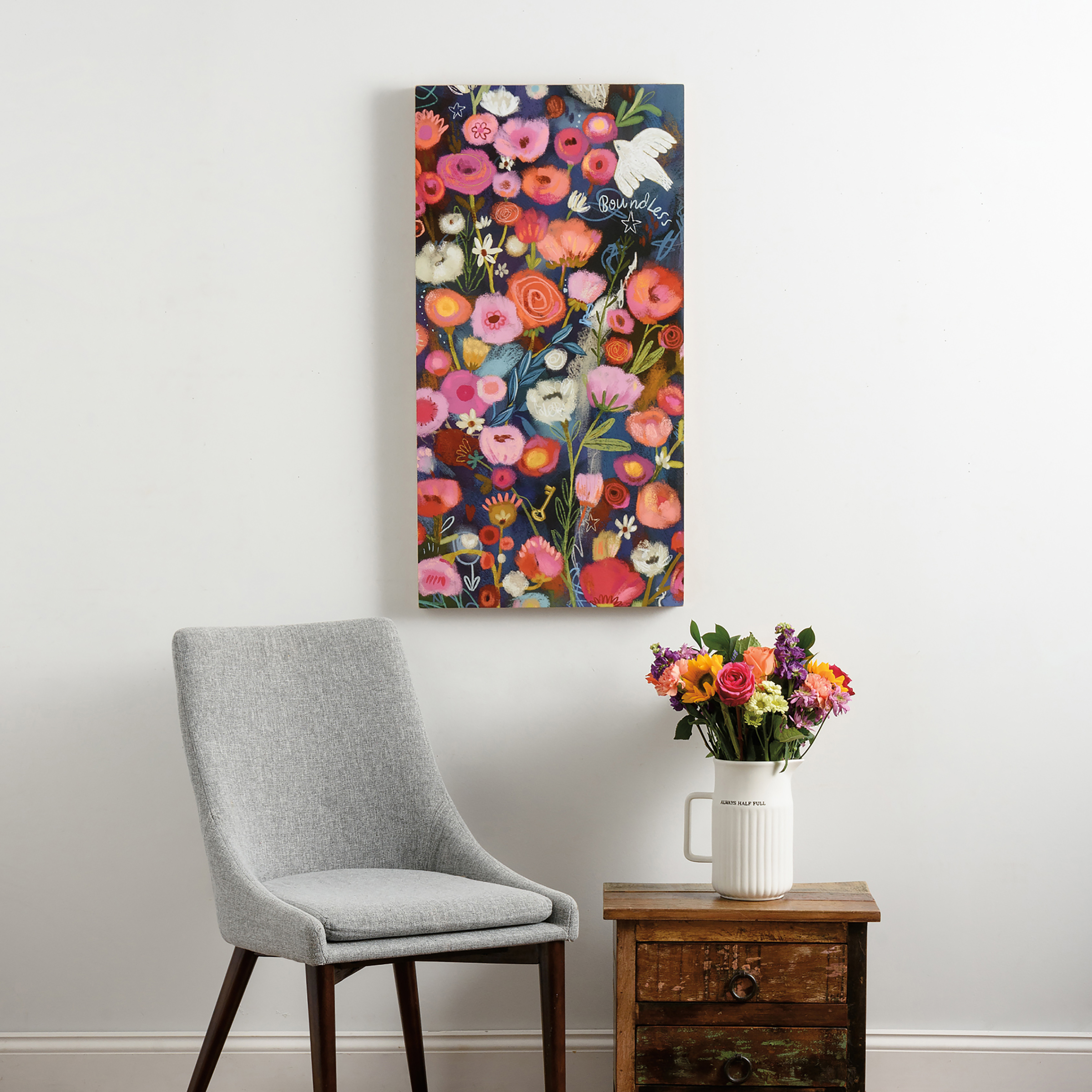 A large wood sign featuring vibrant floral designs and inspirational "Boundless" sentiment. Wooden wall art is easy to hang and makes a perfect statement piece.