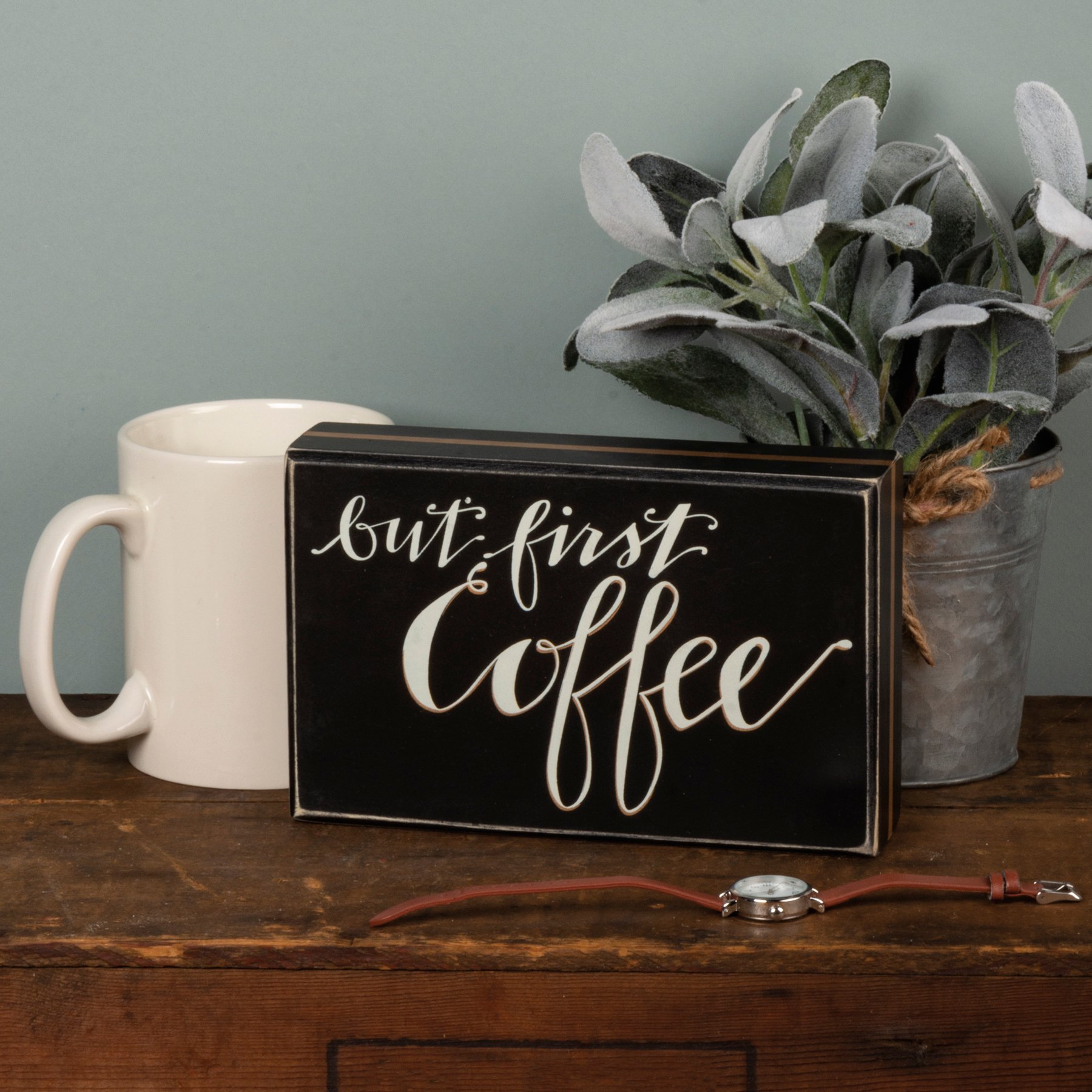 A black and white wooden box sign from our Hand Illustrated Collection features a hand lettered "But First Coffee" sentiment. Complements well with existing decor or coordinating design pieces. The But First Coffee sign is easy to hang or can free-stand alone.