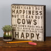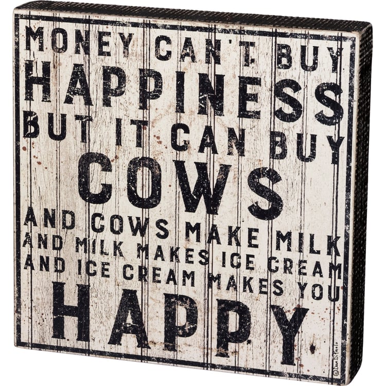 A rustic wooden box sign lending a distressed "Money Can't Buy Happiness But It Can Buy Cows And Cows Make Milk And Milk Makes Ice Cream And Ice Cream Makes You Happy" sentiment. Easy to hang or can free-stand alone. Complements well with coordinating designs or existing decor.