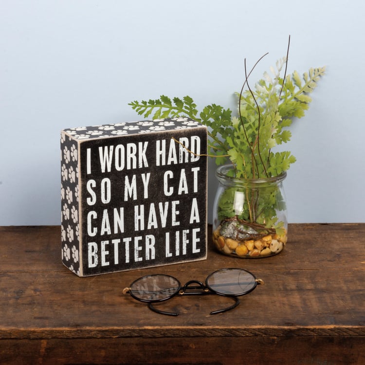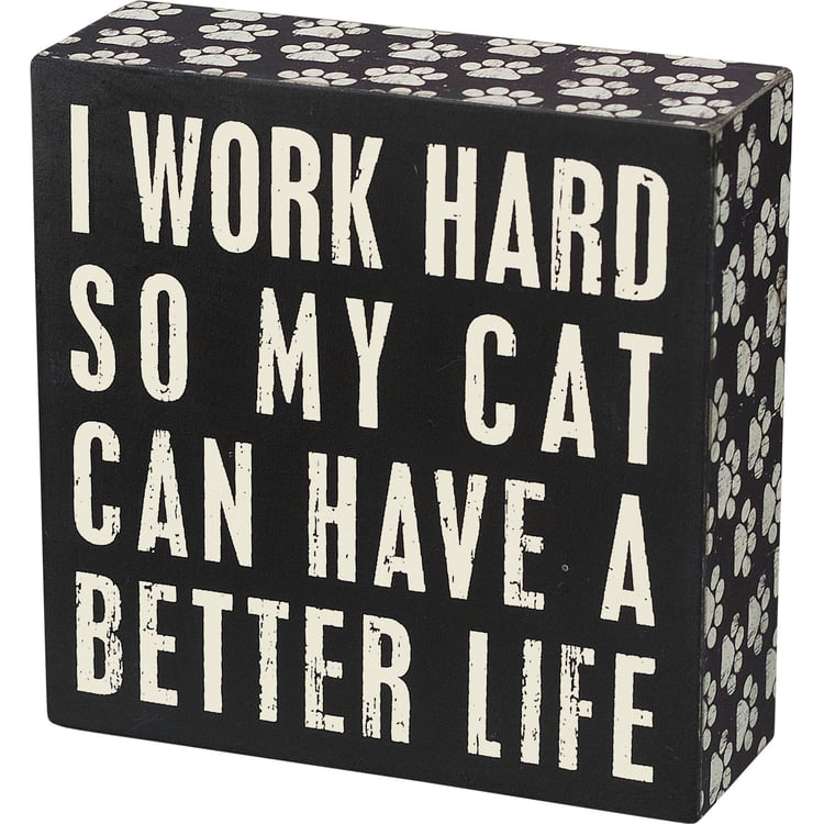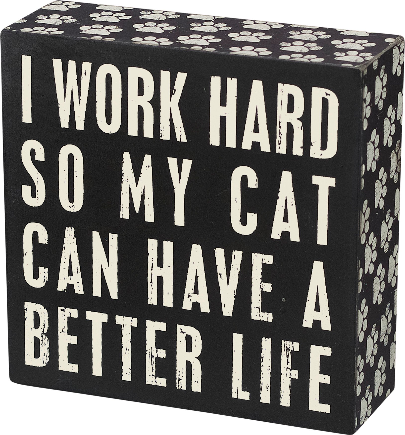 A classic black and white wooden box sign displaying a heartwarming pet-themed sentiment that reads "I Work Hard So My Cat Can Have A Better Life." Pet box sign features distressed details with a coordinating paw print pattern on the sides. Our Cat Can Have A Better Life sign is easy to hang or can free-stand alone. A lovely pet-themed gift that can be easily displayed in any home or work space.
