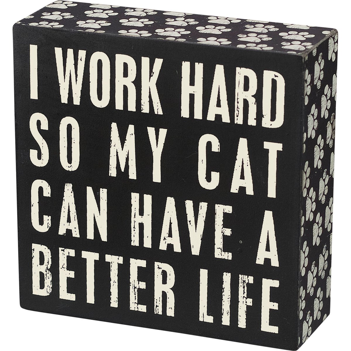 A classic black and white wooden box sign displaying a heartwarming pet-themed sentiment that reads "I Work Hard So My Cat Can Have A Better Life." Pet box sign features distressed details with a coordinating paw print pattern on the sides. Our Cat Can Have A Better Life sign is easy to hang or can free-stand alone. A lovely pet-themed gift that can be easily displayed in any home or work space.